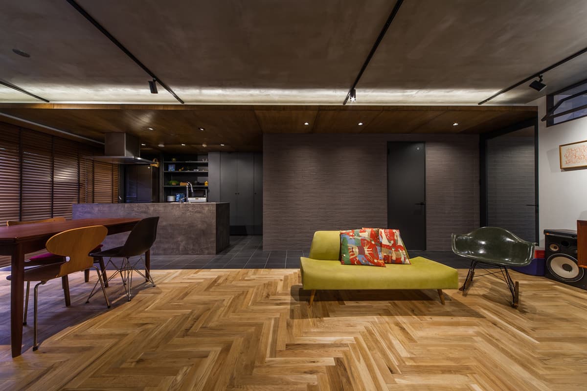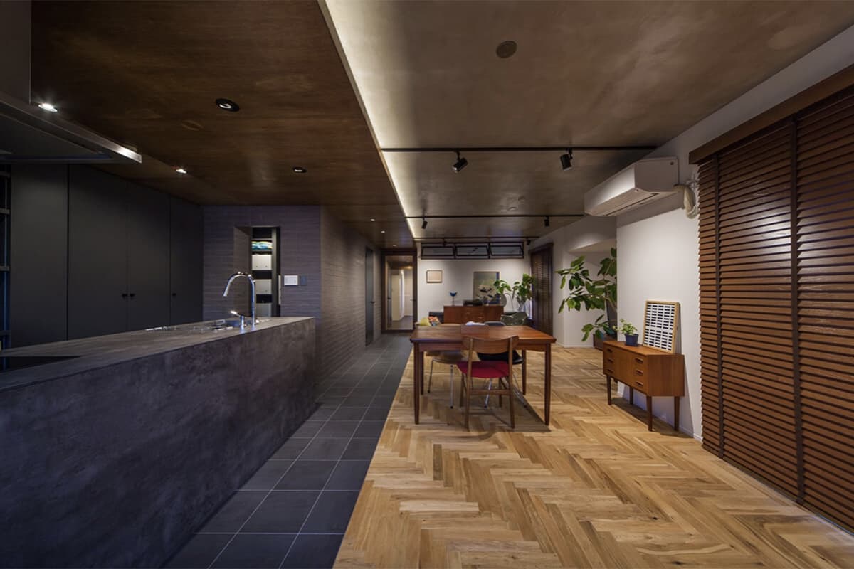 北欧家具を収集している施主のマンションリノベ。子供部屋は寝室のみとして、広いLDKに勉強できるスペースを配置。リビング側の床はオークのヘリボーンをアクセントにして、キッチン側とメリハリをつけた。冷暖房効率も上がり、暮らしやすい住まいとなった。