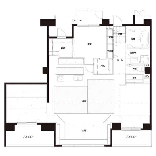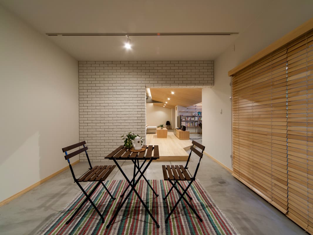 フラットになりがちなマンションの天井に木張りの傾斜天井をつけ、日本の平屋がもつ落ち着きを醸し出した。LDKの窓辺には土間を確保。縁側を思わせる空間は、書斎や家族団らんの場となり、新しいLDKの楽しみ方も提案している。
