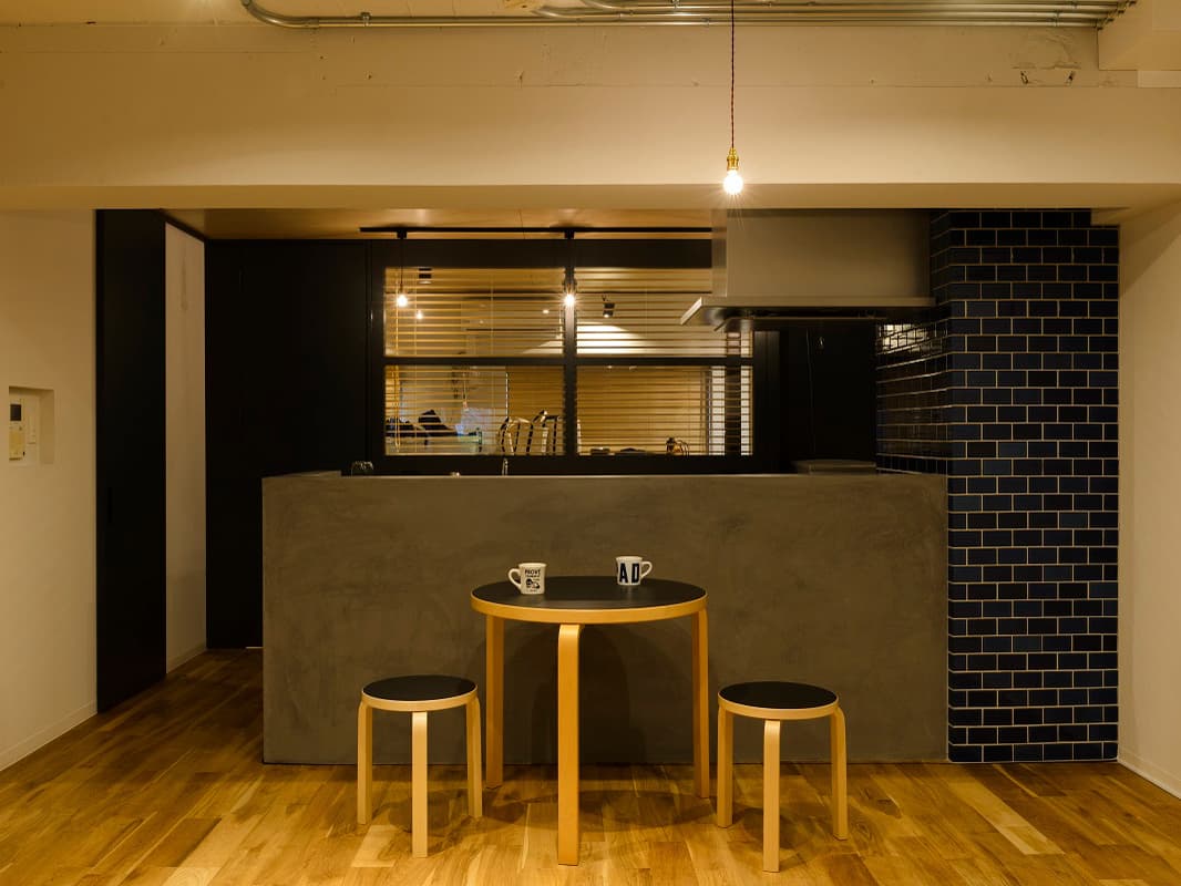 経営者のためのテレワークができるマンションリノベ。玄関からすぐの土間には、アウトドア道具、サーフボードなどが置かれ、道具のメンテやテラスのような使い方もされている。そのままLDKにつながり、その奥に仕事部屋を兼ねた書斎が配置されている。