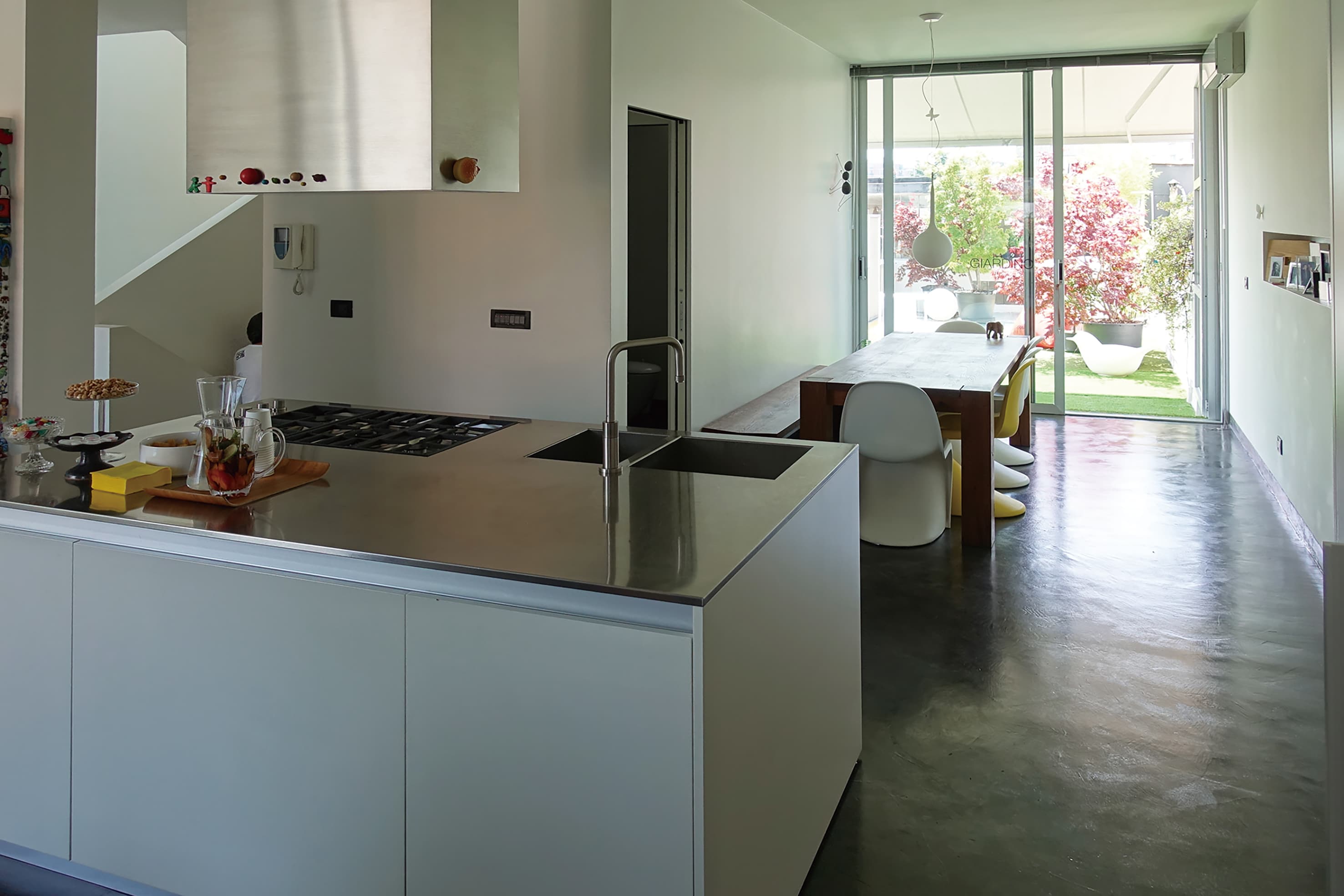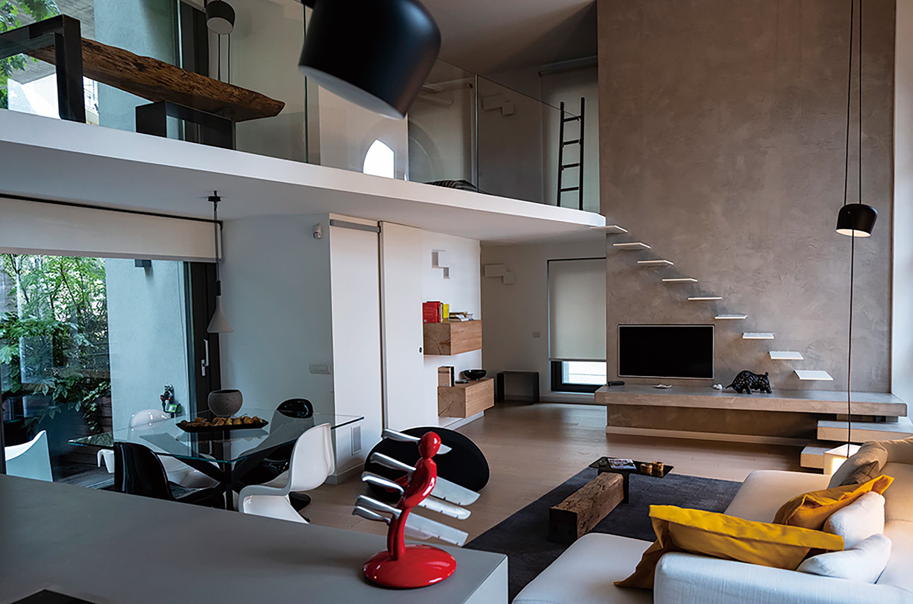 最後は建築家のステファノさんが住む、かつて映画館だった建物を2013年に住宅に改築した、地上2階地下1階のロフト。交通量の多い通りに面しているにも関わらず、中庭の緑がまるで別世界のような静けさと涼しさを保っています。地下にはサウナとジャクジーまで完備した秘密基地のようなジム(非公開)があり、寝室とバスルームなどプライベートな空間を全てロフト階に収め、地上階を開放的なリビングダイニングにすることで、地下を訪れる友達と気軽に使える空間になっています。