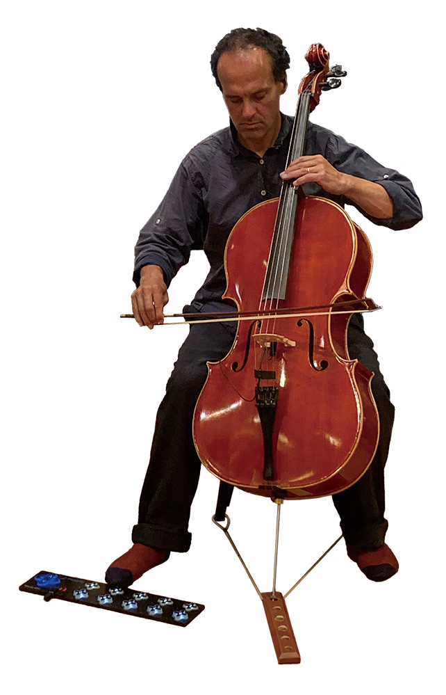 サイモンは録音した音をループさせ、さらに録音した音を加えて、音の層(レイヤー)を重ねる方法を楽曲制作やライブに取り入れています。足元に専用パッドを置いて、足先で器用に録音ボタンを押し、手元ではチェロを奏でる姿は踊っているよう!一層、また一層とさまざまなリズムや音色が重ねられ、聴く人はいつの間にか彼の音楽の世界に入り込んでしまうのです。