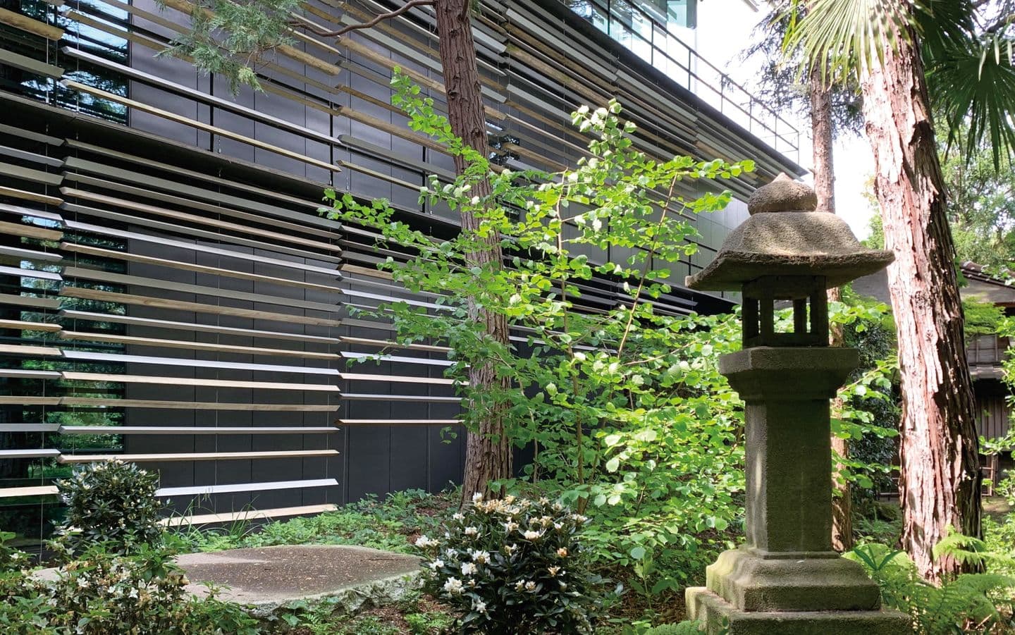 建築素材として木材が多用されています。外面には、長く細い木材を簾のように組んで配置したり、建物全体に「縁側」を付けていて、日本庭園との調和は色彩も合わせて完璧なものだと思いました。それはまた日本に感銘を受け、日本をフランスに紹介したカーン氏の嗜好にもとてもよくマッチしたものだと思います。