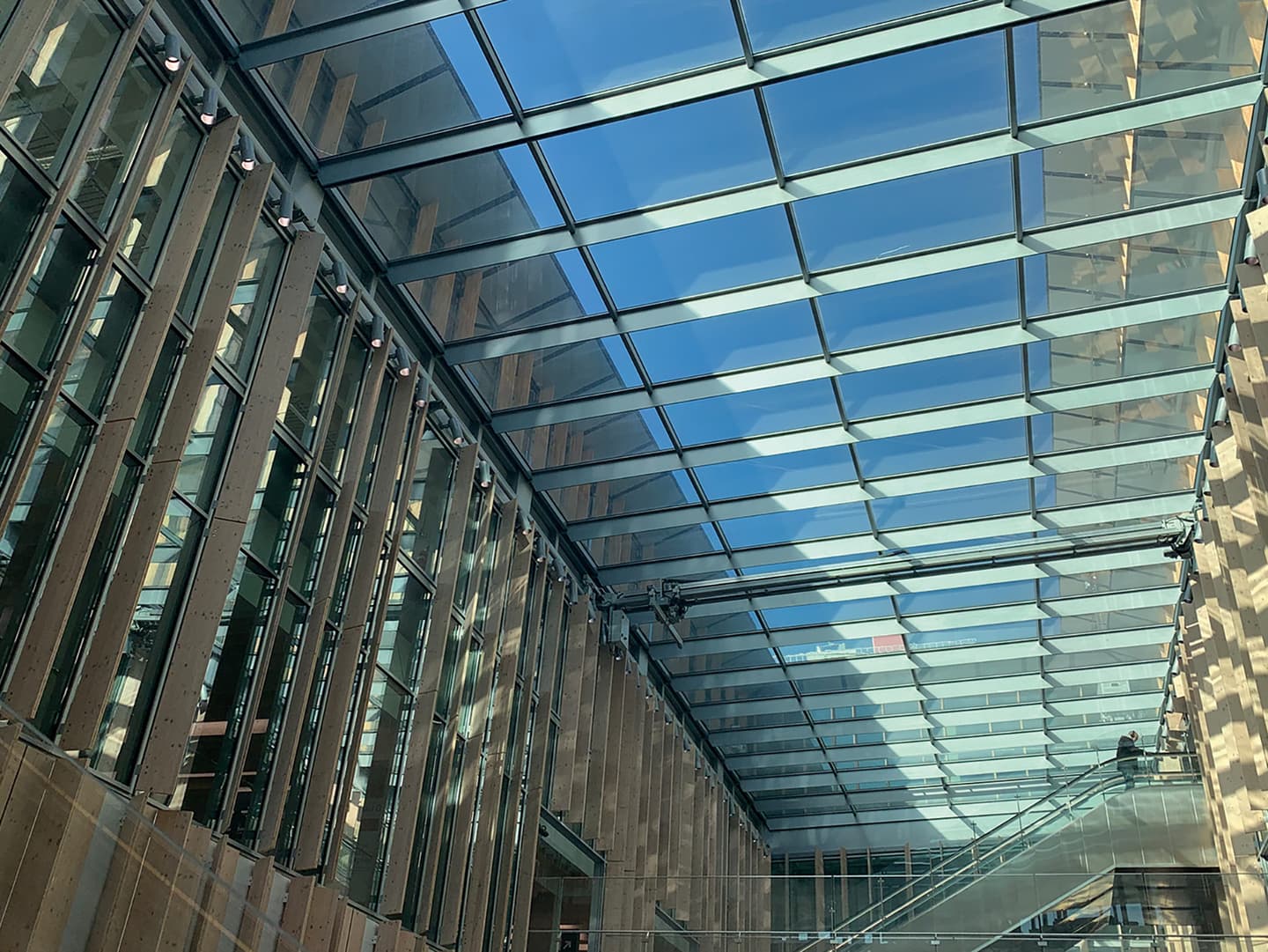 この駅には、隈研吾氏の建築の特徴が随所に見られます。最も目に付くのは、建築の随所に張り巡らされた木材の装飾です。また自然光を重視して、地下にまで光が届く吹き抜けを中央部に設けています。