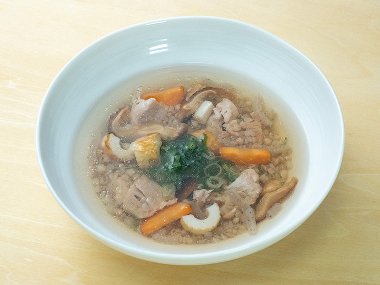 ① 蕎麦米とたっぷりの水を鍋に入れて火にかけ5分ほど湯がいたあと、ざるにあげお湯を切っておく。