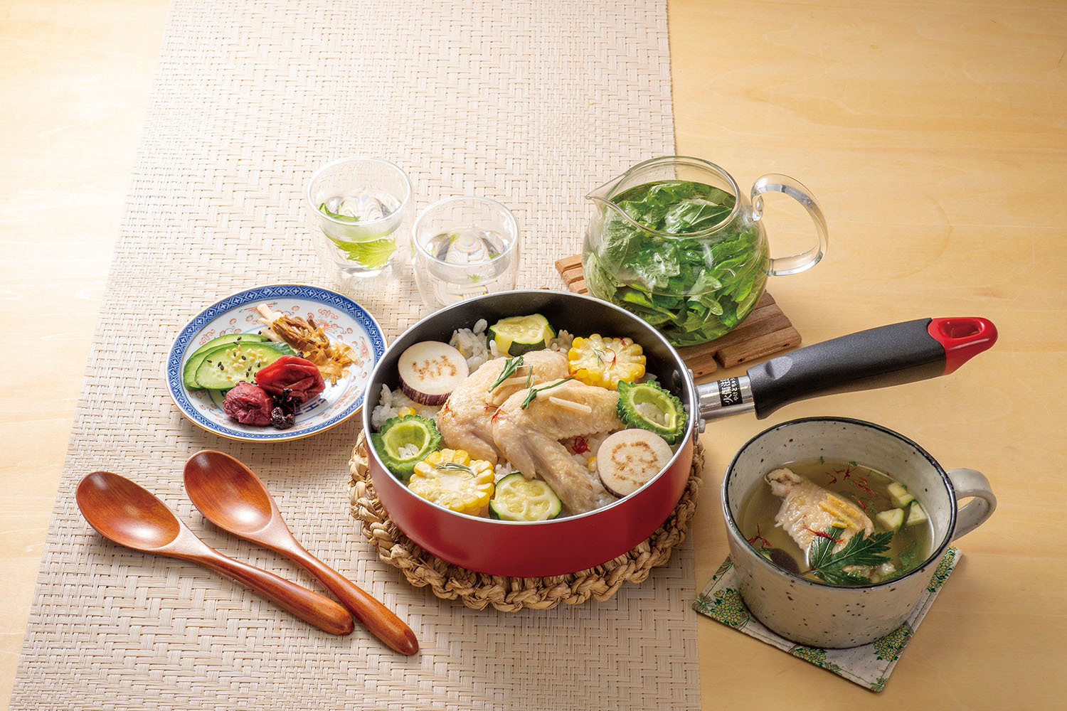 ① フライパンに基本のスープとお米を入れ、その上に手羽先とトウモロコシを入れて蓋をし、弱火でお米を炊く(20~25分)