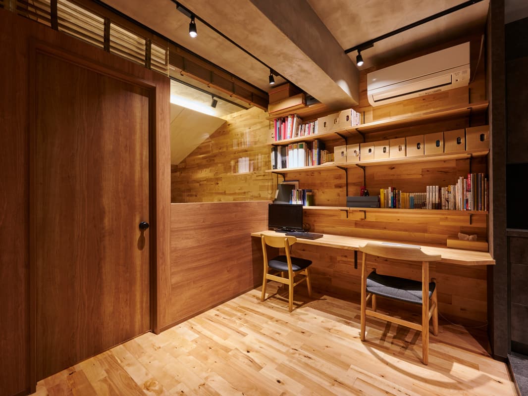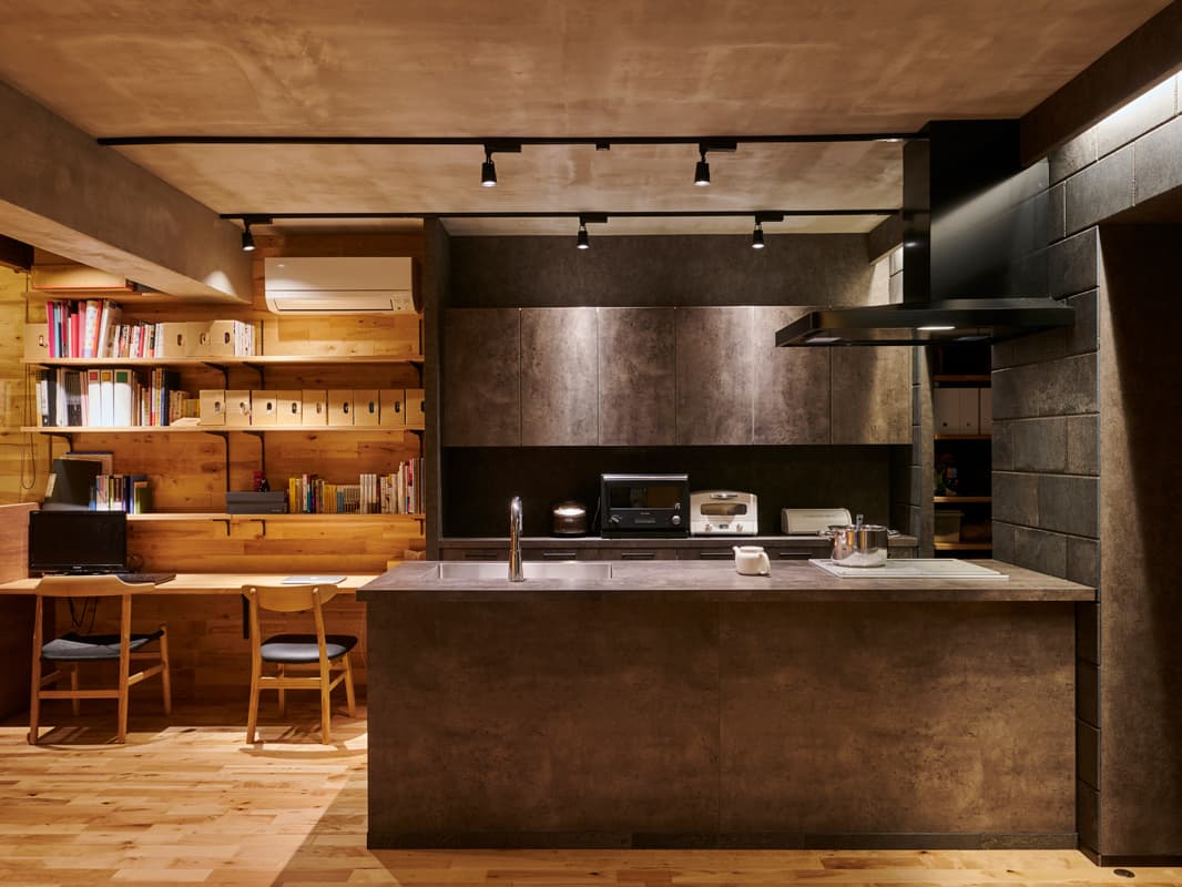 kithcenhouse製のオーダーメイドキッチン。その横には本棚のあるワークスペース。