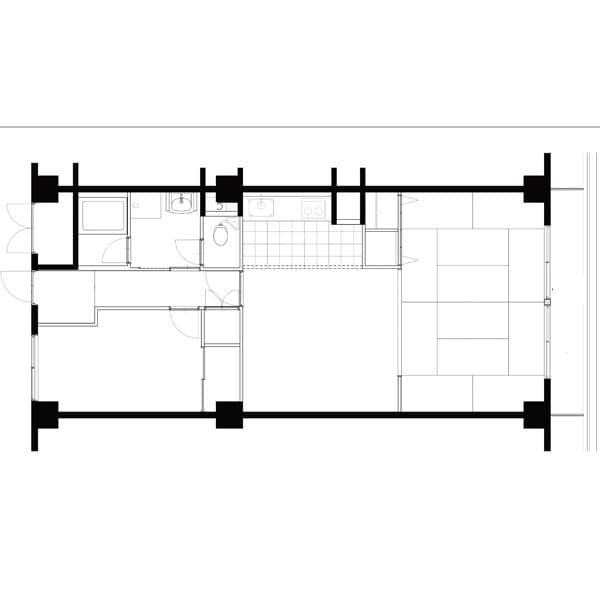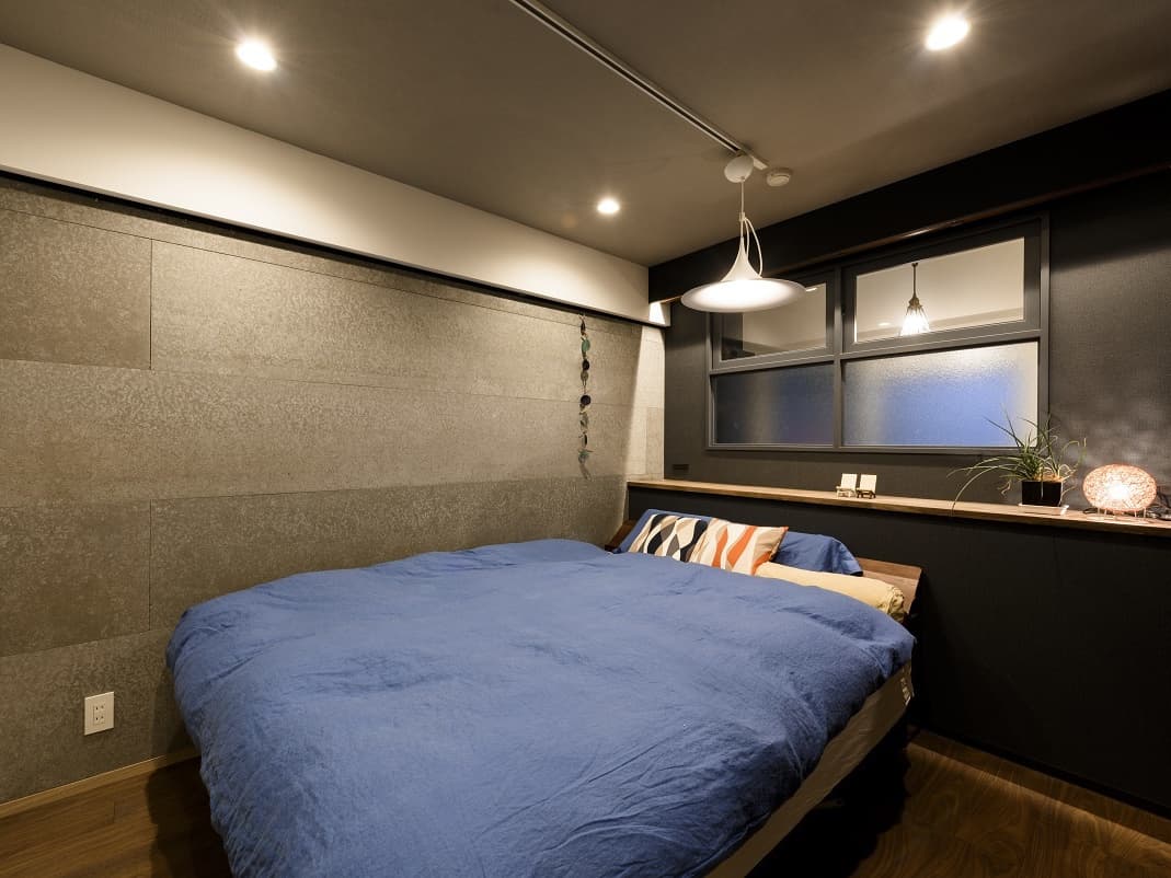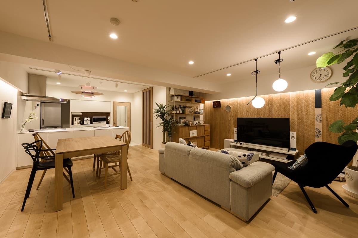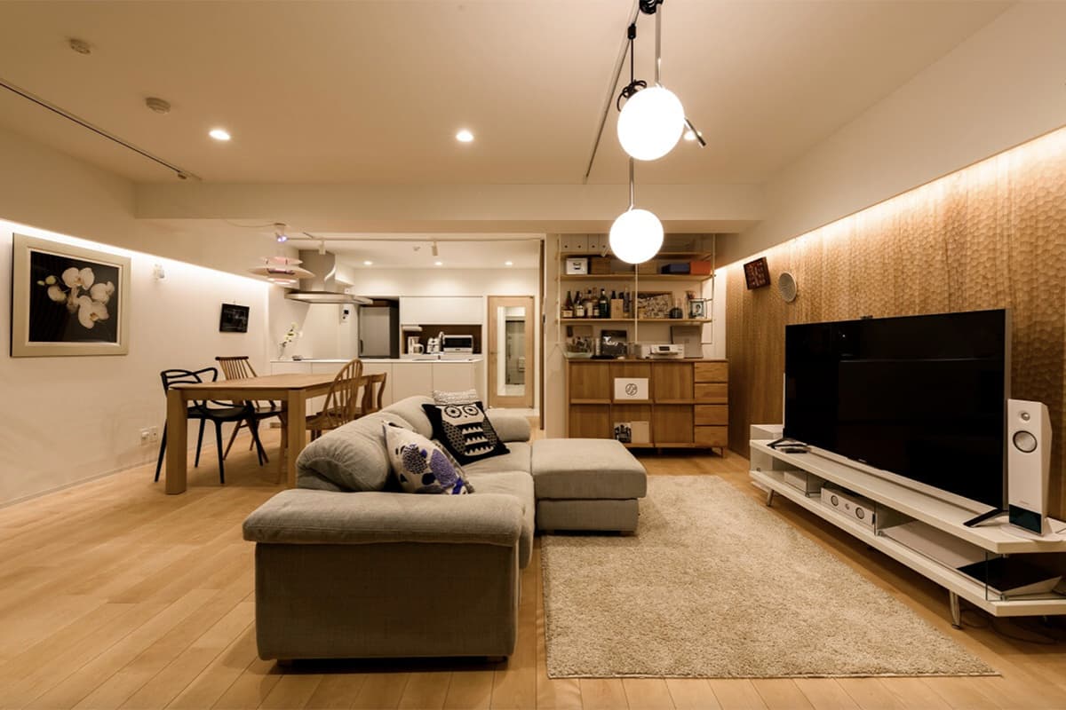 築40年以上のマンションリノベ。12畳の和室があったLDKは、TV壁面に天然木の名栗壁があしらわれ、間接照明があたったラグジュアリー空間へ変貌した。また、エントランスの外廊下側には土間スペースが配置され、プライバシーも向上した。