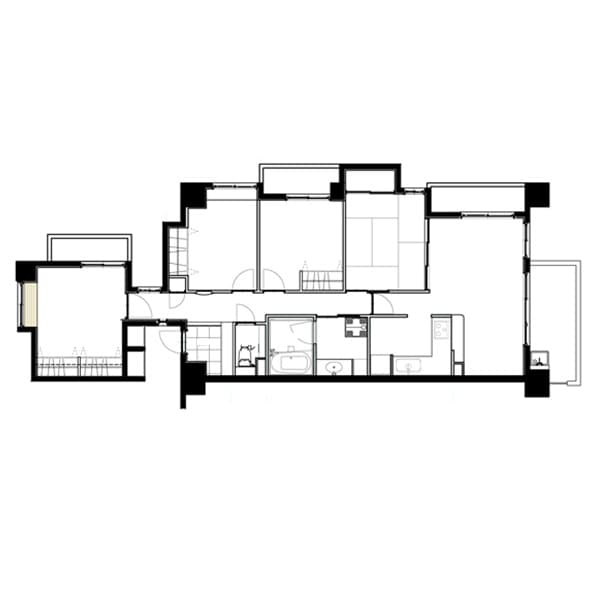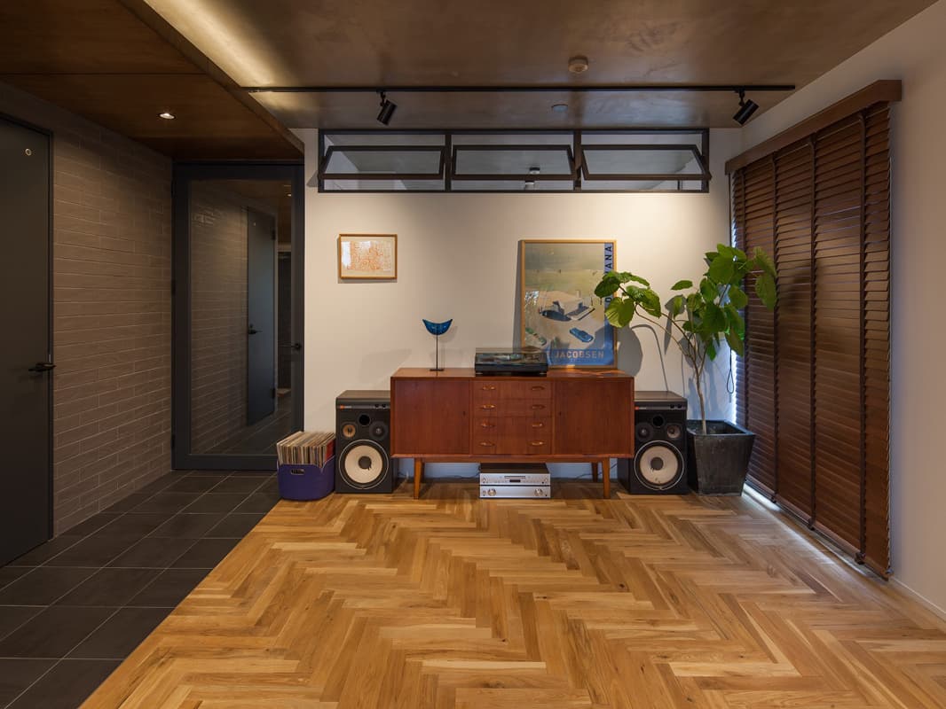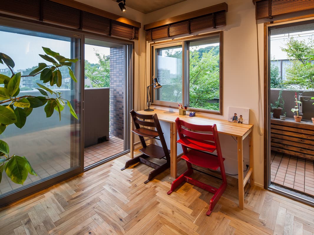 北欧家具を収集している施主のマンションリノベ。子供部屋は寝室のみとして、広いLDKに勉強できるスペースを配置。リビング側の床はオークのヘリボーンをアクセントにして、キッチン側とメリハリをつけた。冷暖房効率も上がり、暮らしやすい住まいとなった。