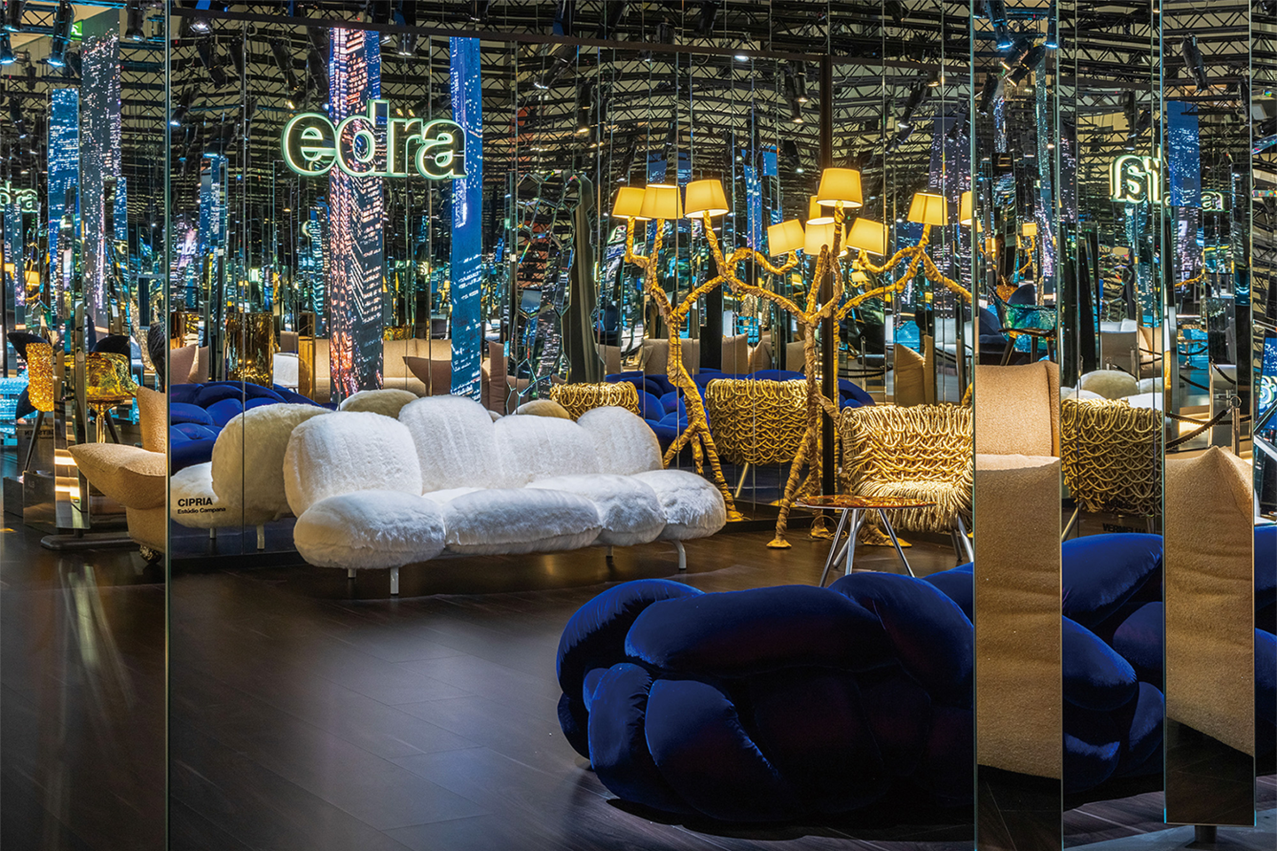 イタリアの新進気鋭ブランドedra(エドラ)は近未来の都会的なブース展示。