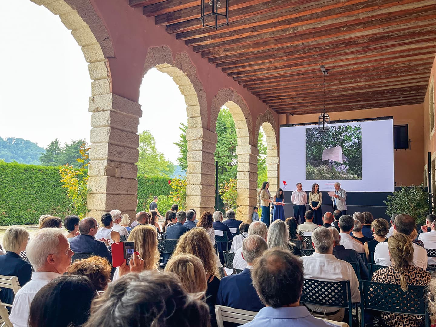 400年の時を超えて丘の上に佇むヴィラの光景は神々しく、内部の圧巻のフレスコ画には参列者一同、言葉がありません。オーケストラの生演奏が素晴らしいロケーションでのパーティーを更に盛り上げてくれ、イタリアという国の誇る歴史や遺産、芸術、自然などの恩恵に改めて思いを寄せる授賞式でした。