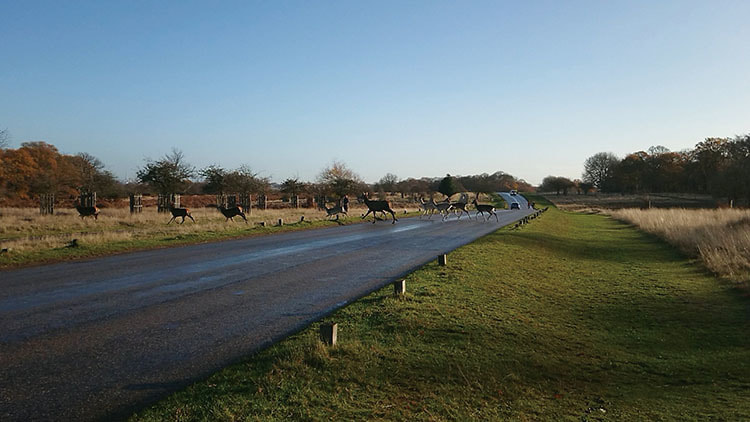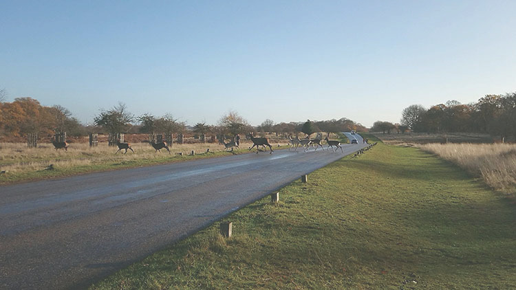 鹿たちが食事をしているすぐそばの道路では車が走り、ロンドンの人たちが朝のランニングをしたりと、この場所には野生動物との生活が身近にあります。また、撮影しているとウォーキング中の方が「グットモーニング!」「いい写真撮れた?」と話しかけてくれるなど、とても気さくです。