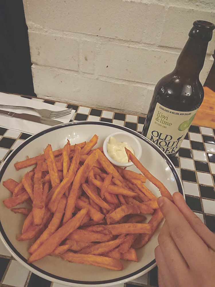 パブでの私のお気に入りは、キウイとライムのサイダーとスイートポテトチップス。このスイートポテトチップスが、フライドポテトとはひと味違い、ほんのり甘く、マヨネーズとの相性バツグンなんです! ちなみに、イギリスでチップスとは、フライドポテトのことを意味します。フィッシュ・アンド・チップスのチップスとはフライドポテトのことなんですね。
