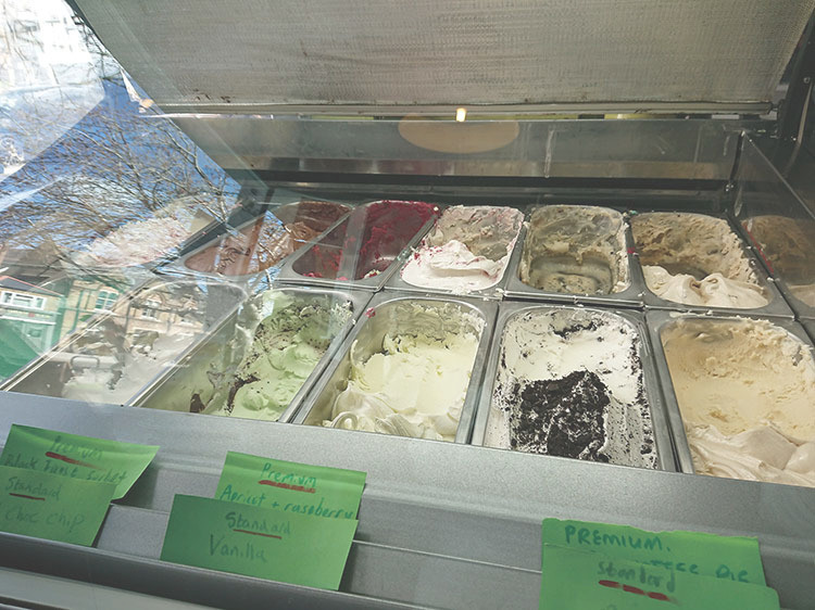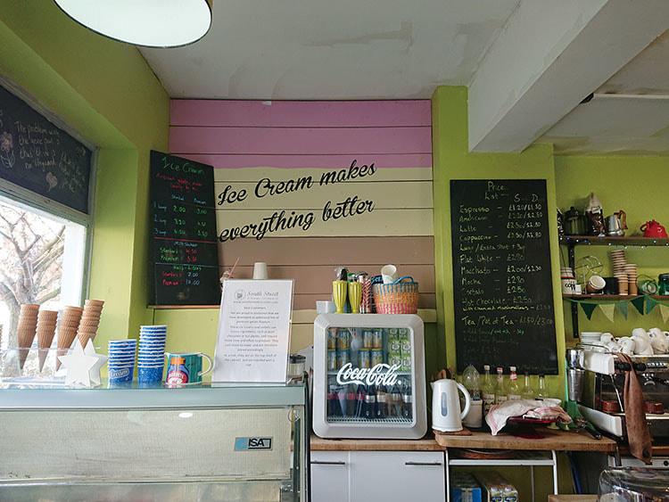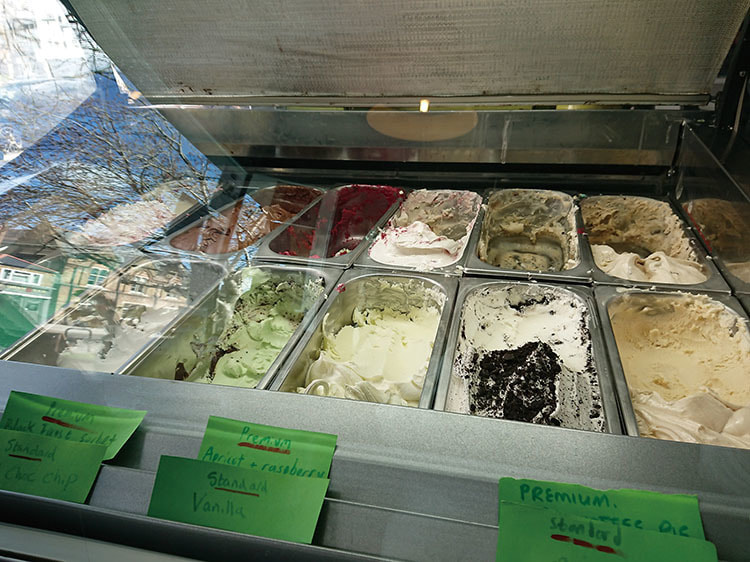 今回は、お店で働いている、とってもチャーミングなJanine Cording(以下、ジェニーン)さんにお話を伺いました。このカフェは6年前にRowan Joyce(以下、ローウェン)さんがオープン。今では、ローウェンさんの息子Tomさんもカフェに携わり、近くの工場でジェラートを作っているそうです。ジェラートはバニラ味などの定番から、週替わりの味も。レジ横にはスコーンやブラウニー、ベリーケーキなどが並び、コーヒーや紅茶も楽しめます。
