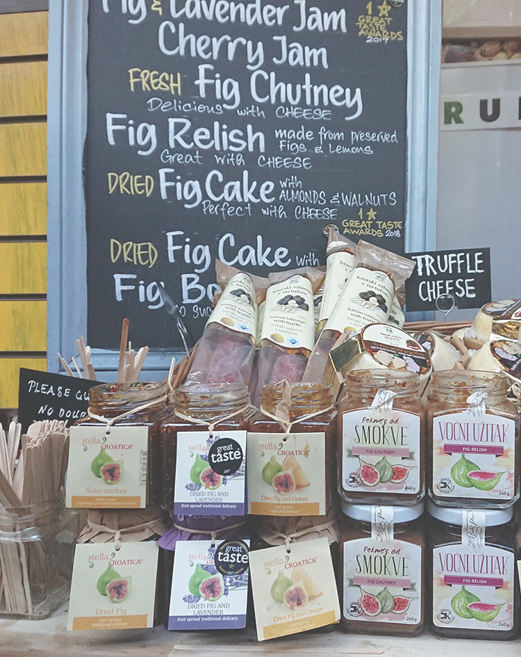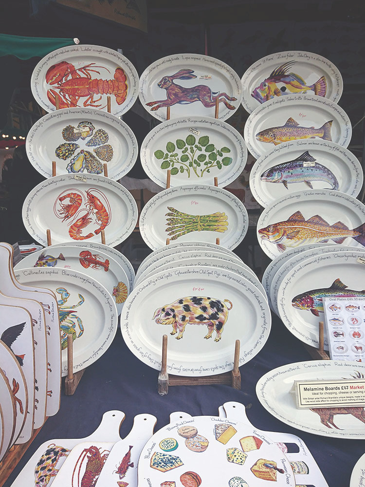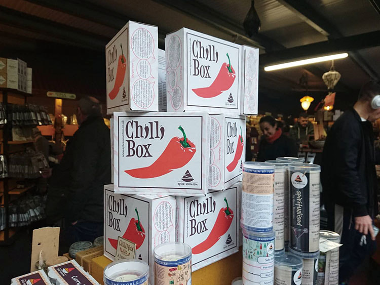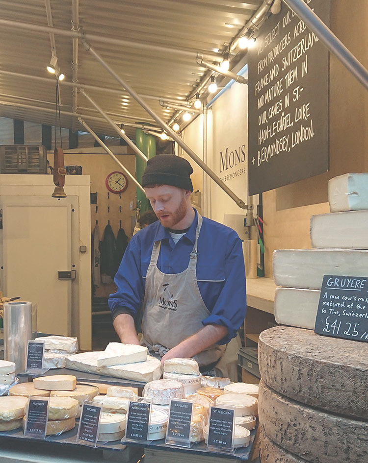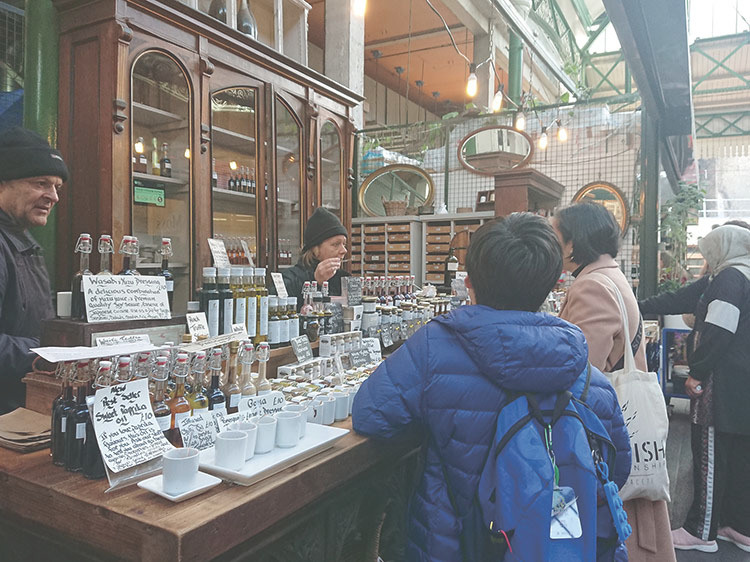 マーケットへ入り目に飛び込んできたのが、chilli(唐辛子)やさまざまなスパイスを扱うお店。インド人も多く住むロンドンでは、本格的なスパイスの効いたカレーが食べられるお店がいくつもあり、壁いっぱいに数多くのスパイスが並んでいました。更に進んでいくと、ジャム専門店、はちみつ専門店、日本人にもお馴染みのモッツァレラやカマンベールなどのチーズを扱うお店が立ち並びます。
