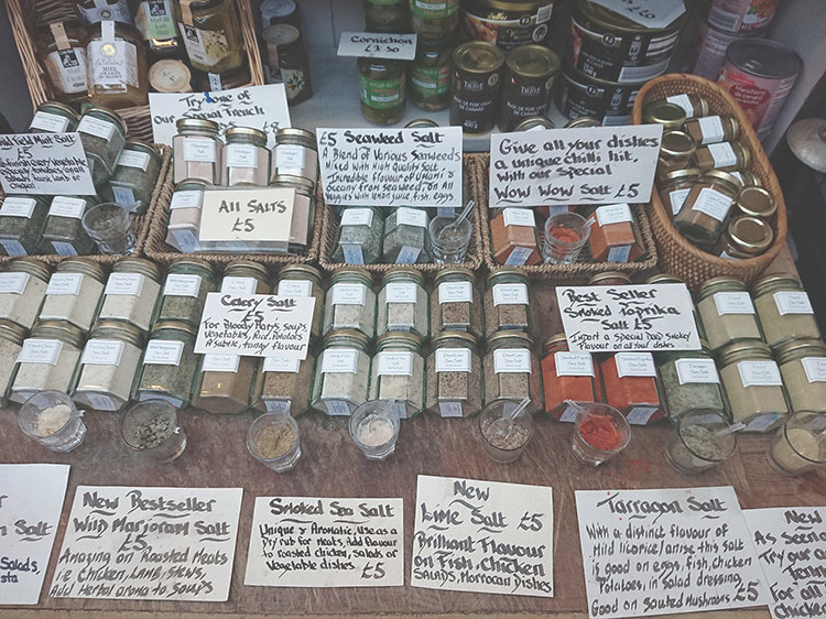 そして気になったのがお塩屋さん! 一言にお塩といっても、いくつもの種類があり、ミントやラベンダーと混ぜたお塩やライム風味のお塩、ガーリックソルトは、お肉にかけるだけで簡単に味付けでき、料理があまり得意ではない私でも、いつもよりちょこっとスペシャルな料理を作れそう。