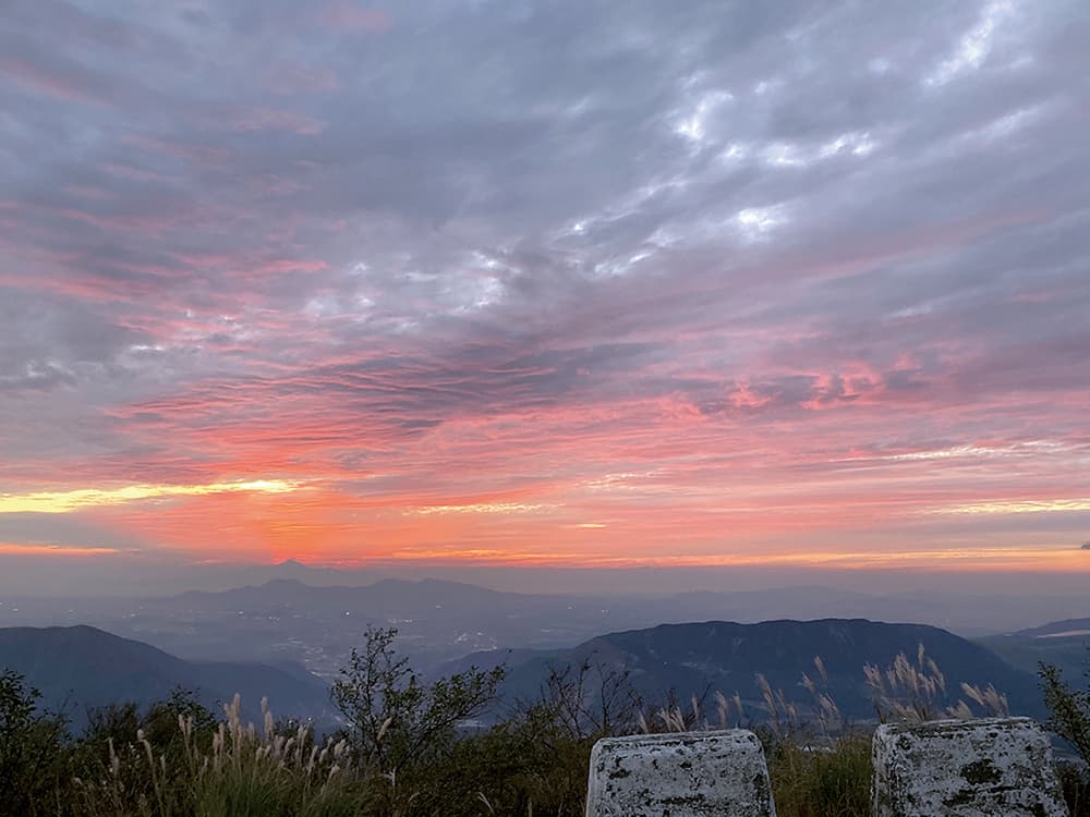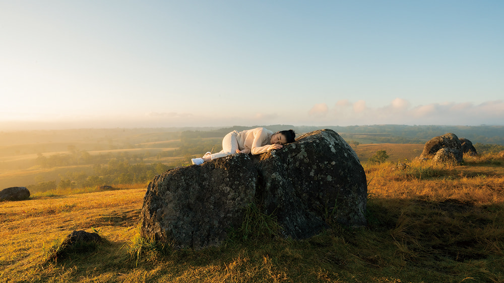 2日目の朝、夜明けの押戸石の丘を訪れると、辺り一面霧に包まれていました。しばらく朝日を待っていると、霧が晴れてゆくのと同時に、見事な雲海が現れました。太陽との距離が近く、体全体で感じた日の光のあたたかさに、幸せな気持ちになりました。丘にある大きな岩に横たわった時、今回の作品テーマ「自然と一体化する」ことを肌で感じられた気がします。深呼吸して身体の力が抜けてゆくと、ひんやりとした岩の中に自分の身体が溶けていくような感覚になりました。心臓が脈を打つのを聞きながら、岩の静かなる鼓動も聴こえるようでした。