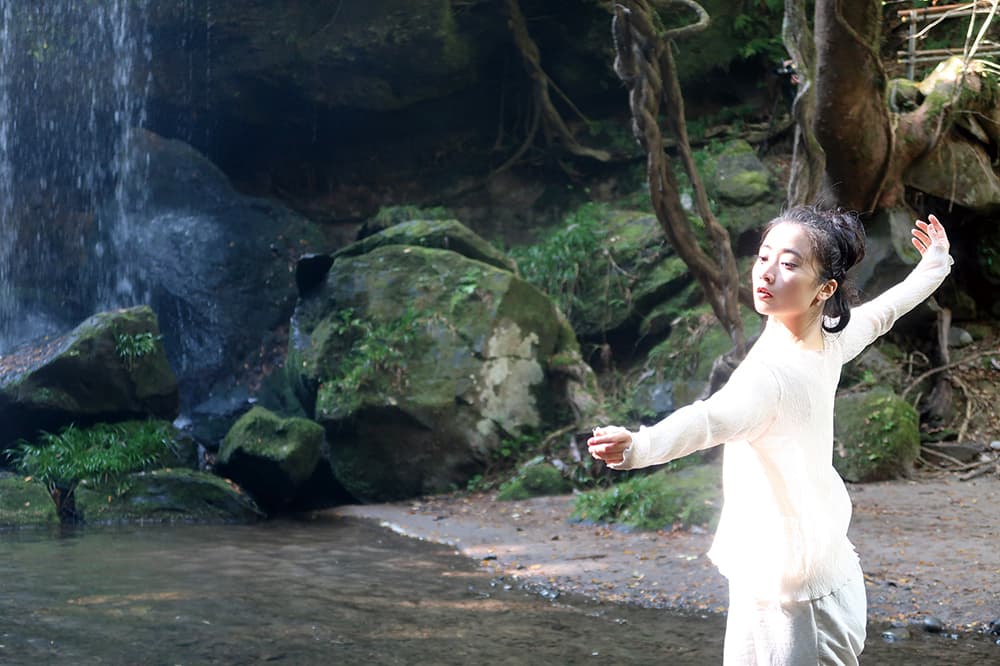 次に訪れた鍋ケ滝では、どっしりとした岩々に叩きつけられる水の音を背に、水しぶきに光る緑と木漏れ日を浴びながら、落ち着いた気持ちで踊れました。