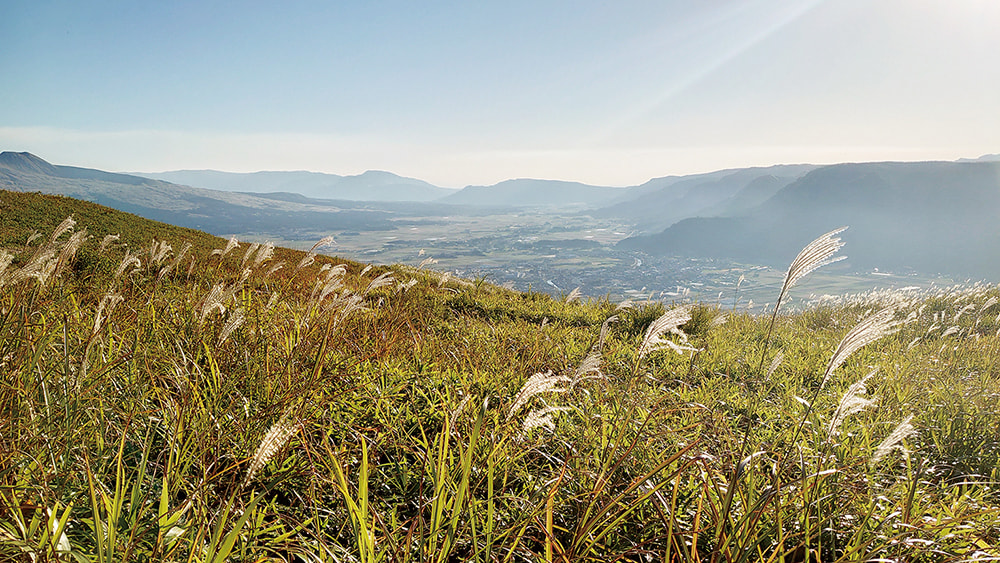 最後に訪れた大観峰では、太陽が当たり黄金色に輝くススキの中で、風と共に舞う。遠くに見える山々と果てしない大地は、脈々と続いてきた生命の偉大さを感じさせます。時として忘れてしまう、人間も自然の一部であるということ。この生命の原点のような阿蘇を訪れると、あなたにも自然の鼓動が聞こえてくるかもしれません。