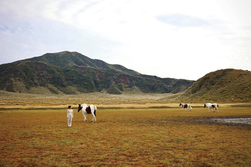果てしなく広がる草千里。撮影が進むうちに、テクテクとカメラのフレーム内に現地で養われている馬たちが!