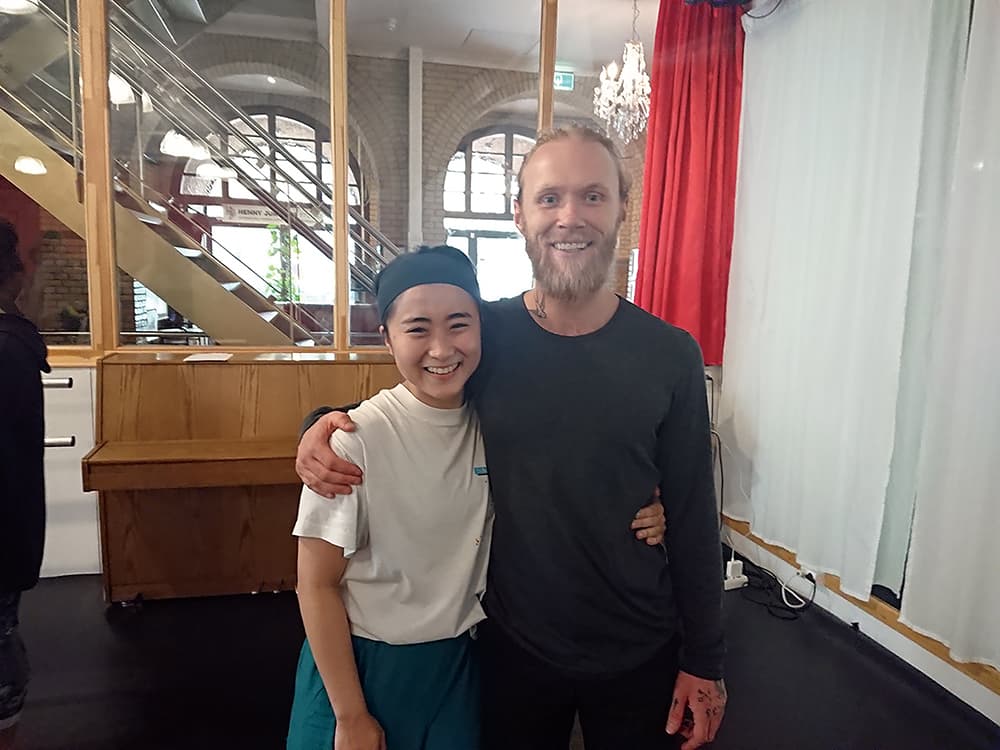 ワークショップの会場は、Chasse Dance Studios。さまざまなコンテンポラリーダンスクラスを受けられるサマースクールも開催され、ヨーロッパ各地からダンサーが集まるスタジオです。落ち着いたオレンジ色のレンガで作られた建物の正面には、蓮の花のようなデザインのガラス窓があり、ワクワクしながら足を踏み入れました。幅広い年代の25名程が参加したワークショップは、朝11時からランチ休憩をはさみ夕方5時まで。ムーブメントリサーチ、動きの研究をしつつ実際に体で実践するスタイルで、神経科学や生体力学、柔術などのアイディアも用います。体の構造や動きを観察、自らの身体と向き合い、より洗練された動きを目ざす濃密な4日間でした。