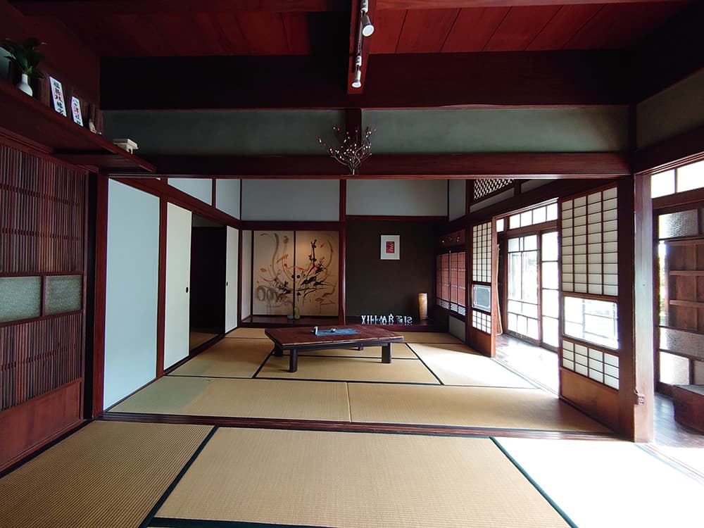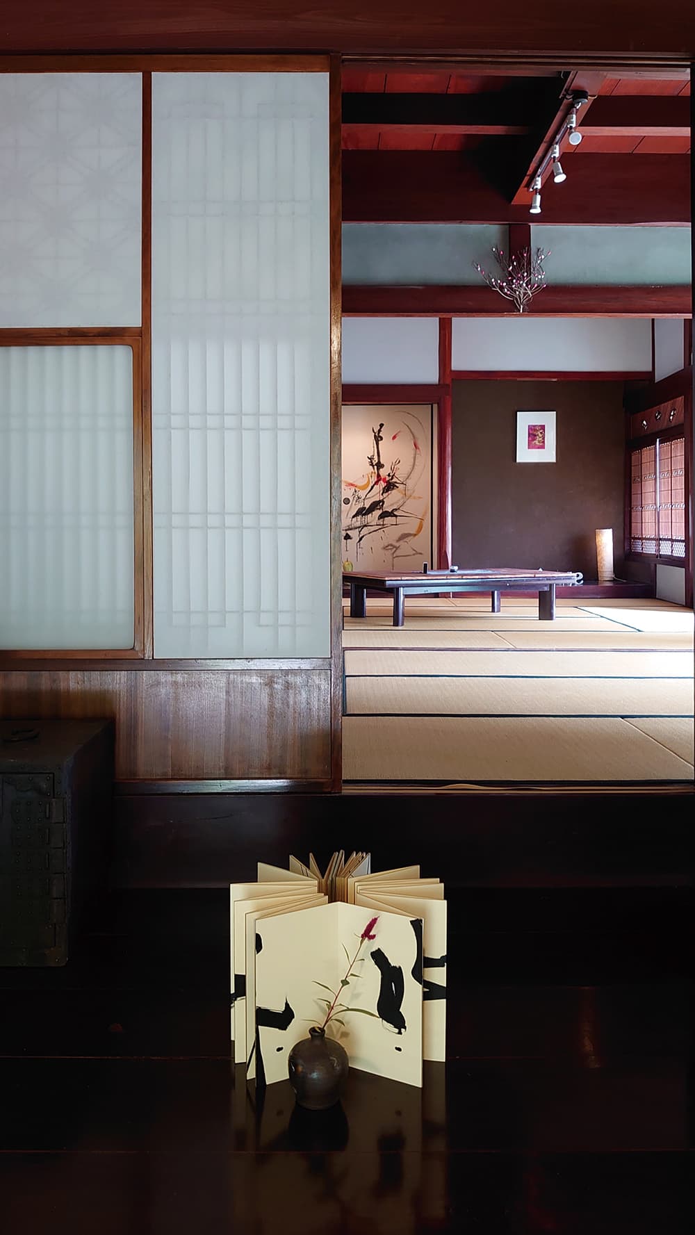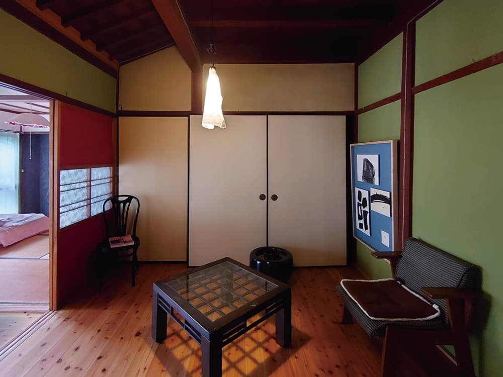 玄関に足を踏み入れると、まず、千香子さんの書の作品がゲストを迎える。じっと見つめたくなる花瓶と千香子さんの作品。シンプルでゆとりのある空間は、私に深呼吸することを思い出させた。彼女と現地の左官さんの手で床を張り替え、時間をかけて壁の色を塗りかえる。大正時代を思わせる渋めの赤、八女茶の色の穏やかな緑、グレー色の壁など、部屋によってサプライズがつまっている。あちこちに千香子さんの工夫があり、地元八女の和紙や福岡出身アーティストの作品も楽しめる。訪れる人たちに、新しいアートとの出会いが生まれる。