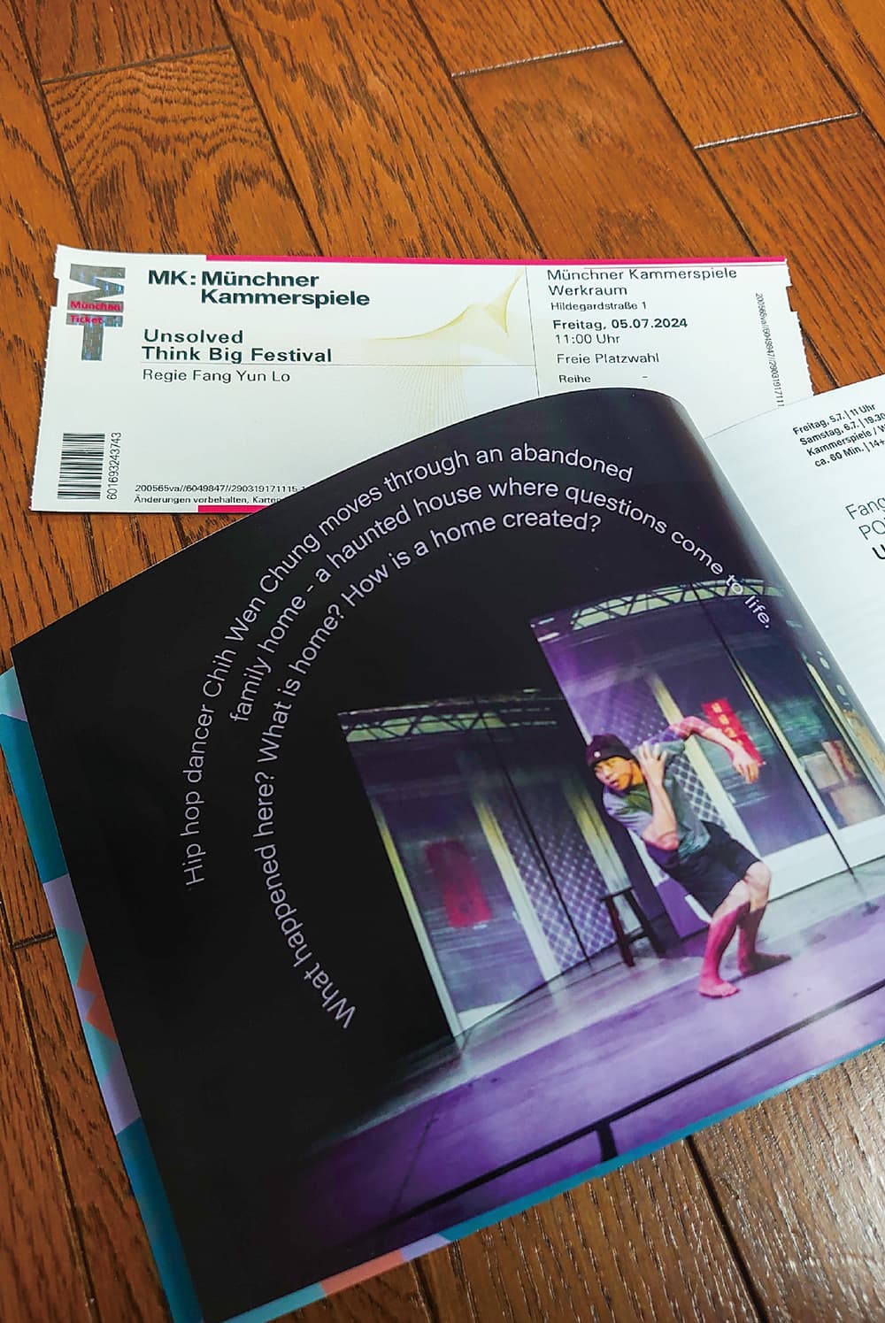 公演「Unsolved」パンフレットとチケット。家とは何でしょう? 家とはどのように作られるのでしょう? と問いが記されています。