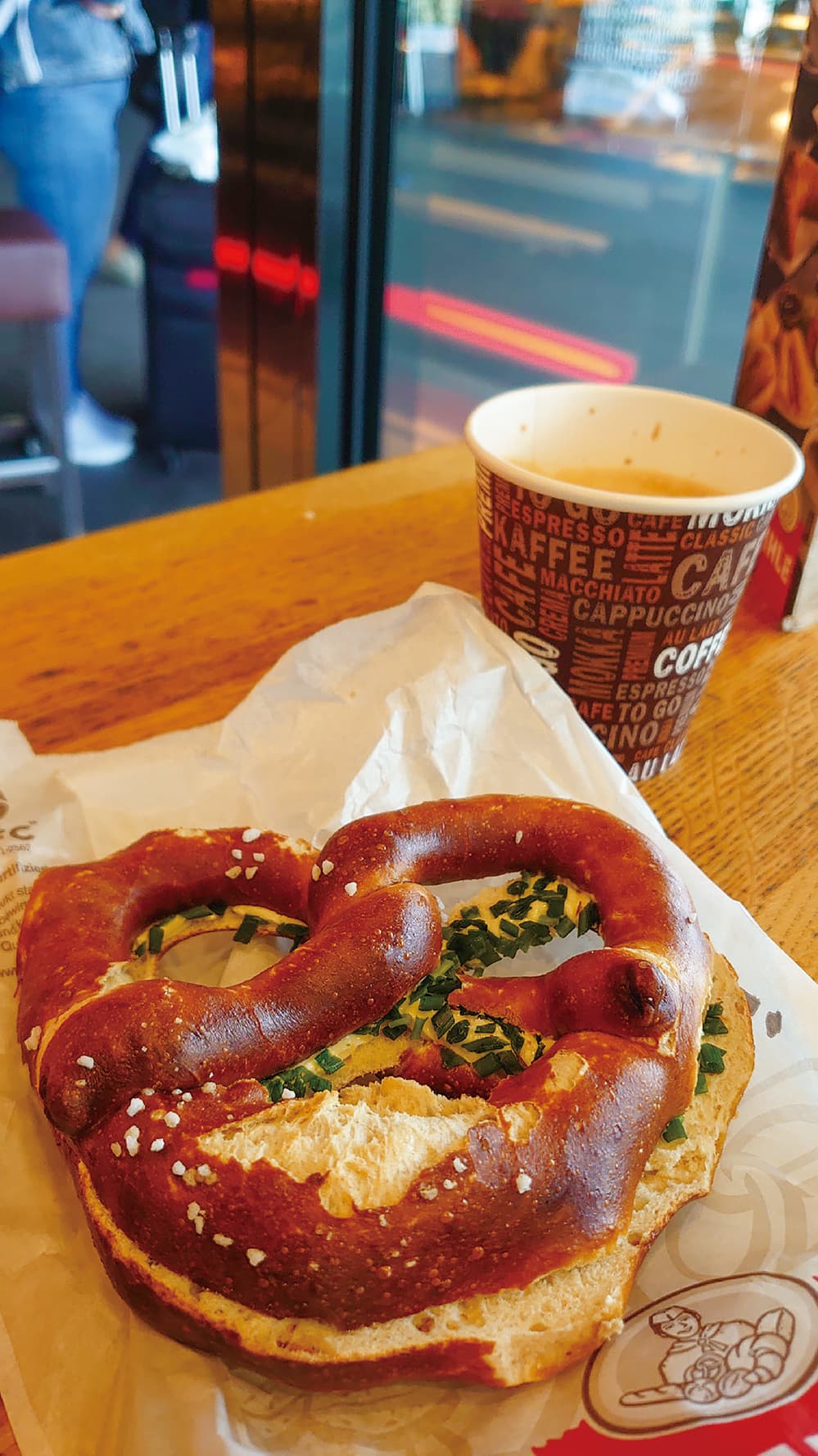 クリームチーズと青ネギ、程よい塩加減のプレッツェルは、11時間のバス旅を終えた体に沁みました!