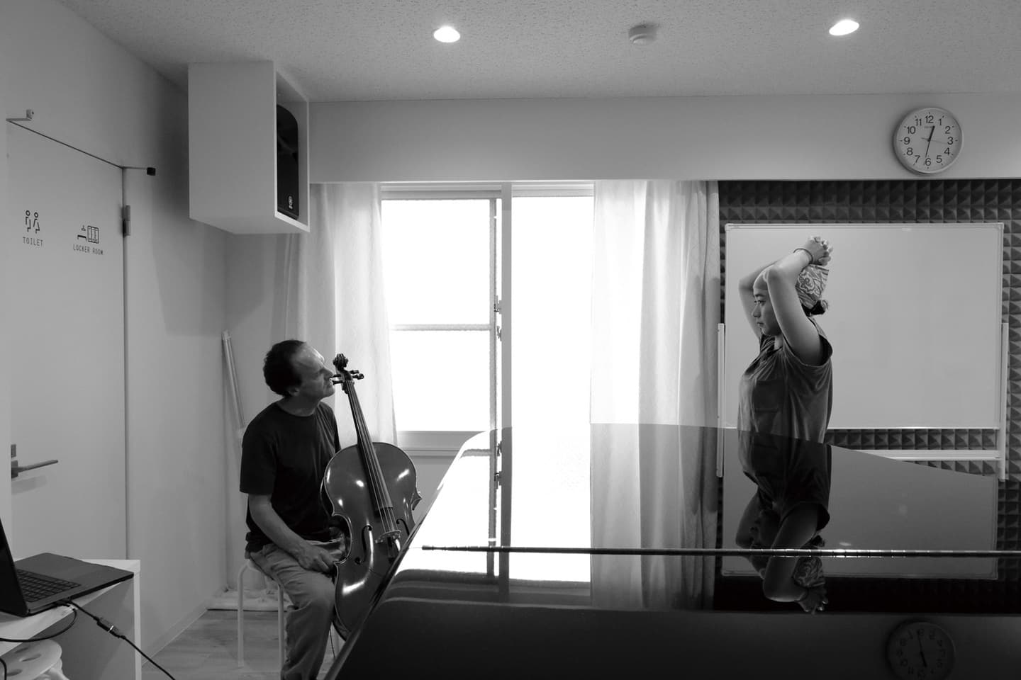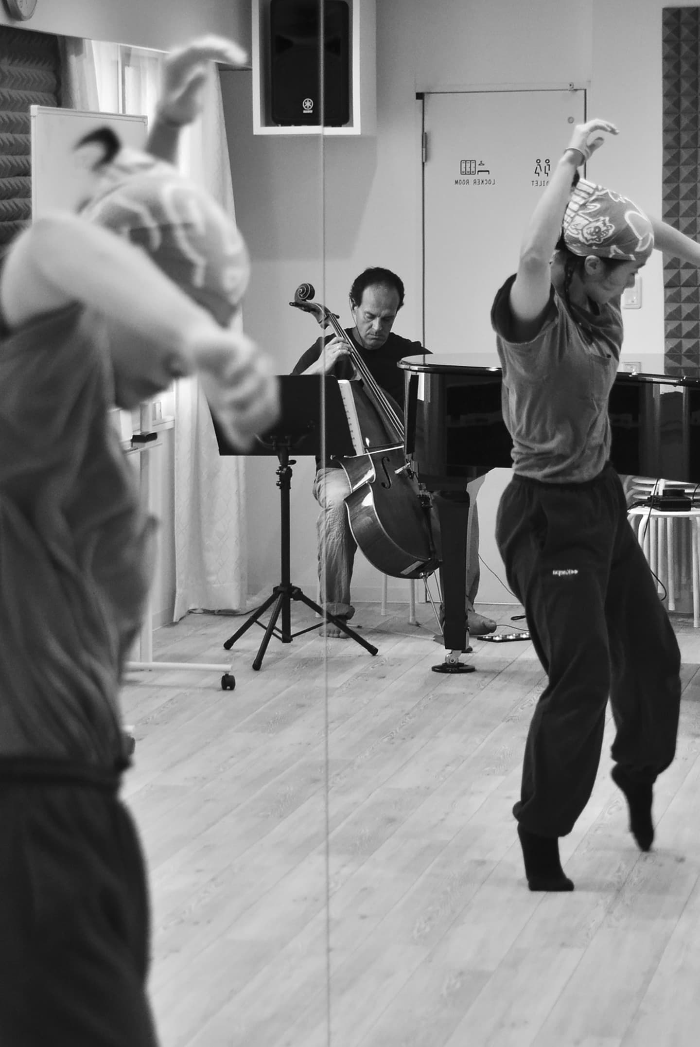 サイモンはチェロでベートーヴェンを弾き、私は床に寝転がり目を閉じて、互いのウォームアップがスタート。サイモンが即興で弾くチェロの音に私も即興で踊り、何度もセッションを重ねるうちに、音に合わせて踊るだけでなく、音に対抗して動く、空間に抗するように踊るというヒントが浮かんできました。