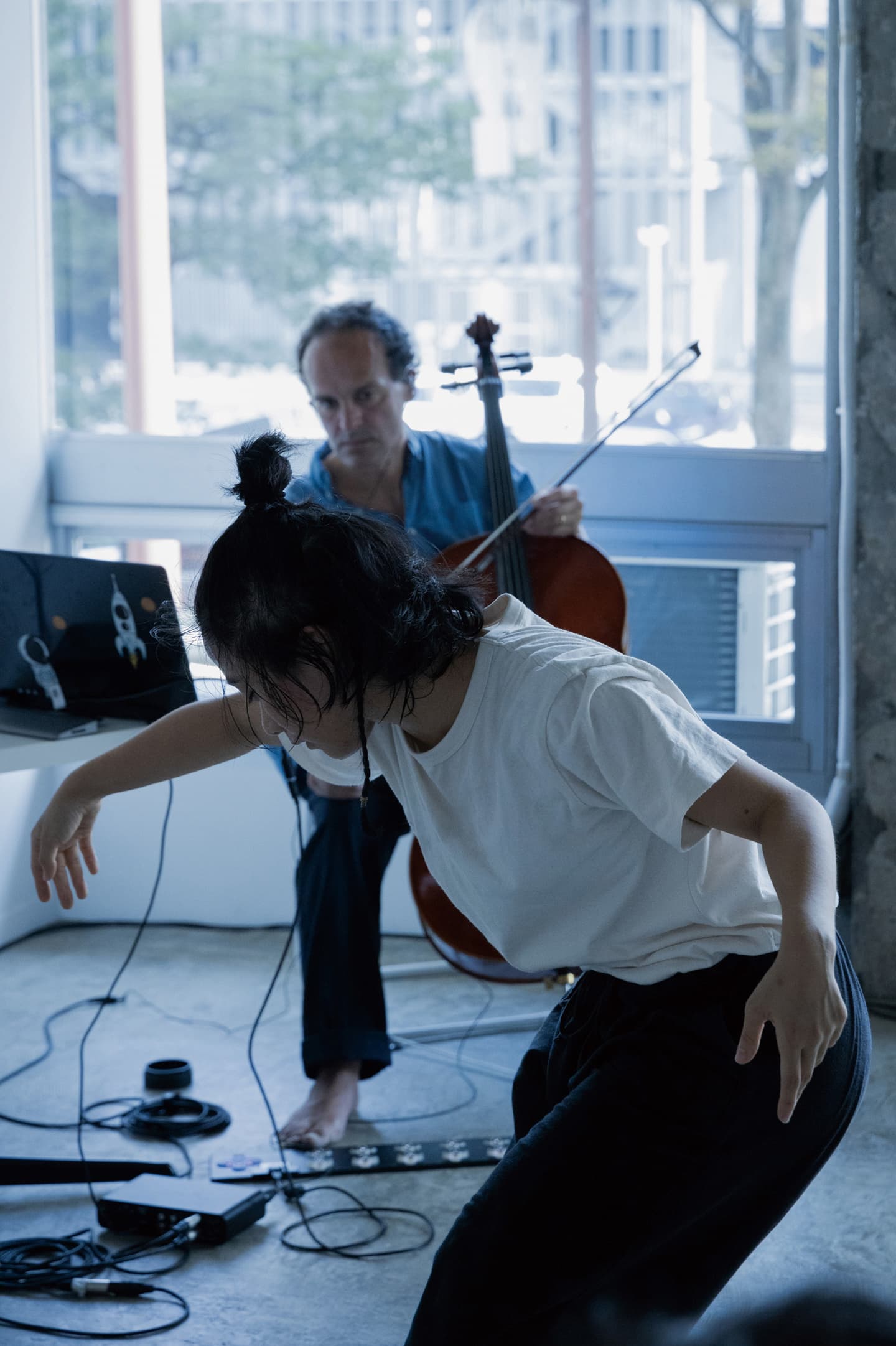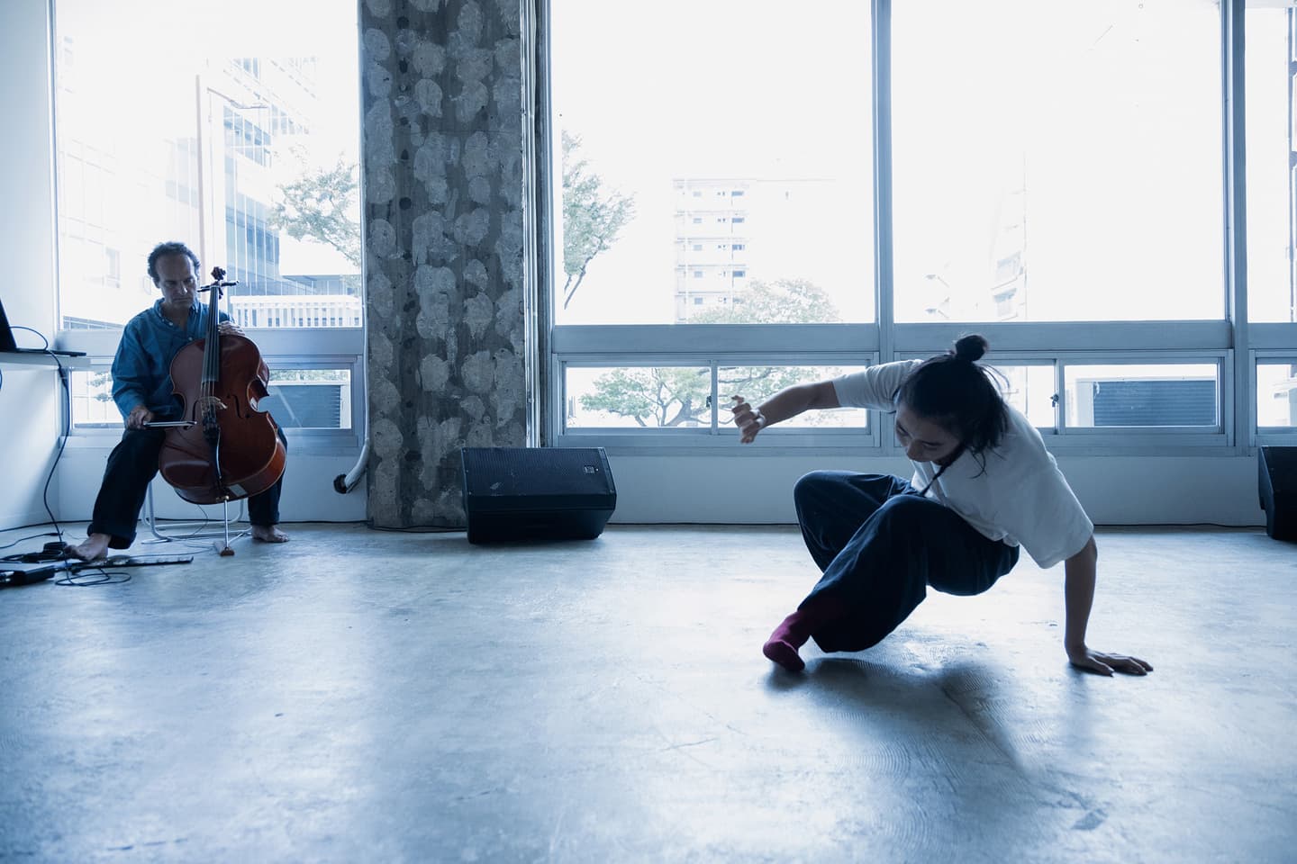 静かな動きで激しさを表現できるだろうか。また逆にテンション(力)の必要な激しい動きの中に静の要素を見出せるだろうか」。私たちのリサーチはそんな問いから始まりました。2023年9月、音楽とコンテンポラリーダンスの新作を作る第一歩として、英国より来日したチェリスト、作曲家のサイモン・マッコリーとの約2週間にわたるリサーチ。