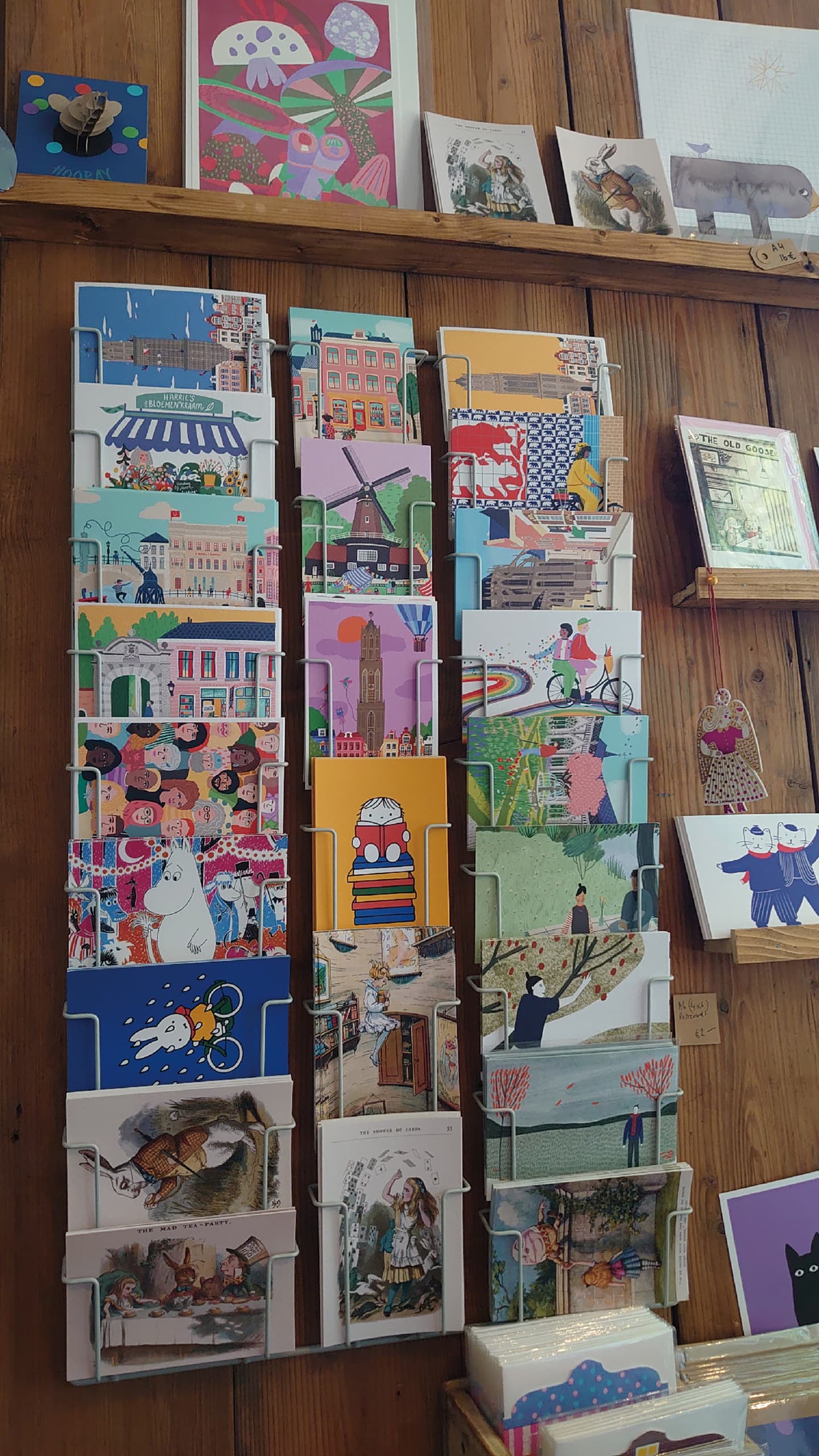 ユトレヒトでは思い出深い出会いがありました。滞在最終日、ドム塔近くのアウデグラハト通りを歩いていると、お店のショーウィンドウにミッフィーやユトレヒトの街並みが描かれたポストカードを発見。思わず中に入ると、そこはPaper Moonという絵本屋さんでした。座って絵本を読めるソファ、隅々までカラフルな絵本で溢れた空間は、子供部屋のような懐かしい雰囲気でした。店員さんに「Hi!」と挨拶をし、絵はがきを見ていると…「あなたが今日初めてのお客さんだから、お店のBGM選んでくれない?」と気さくな店員ジャッキーから粋な提案。