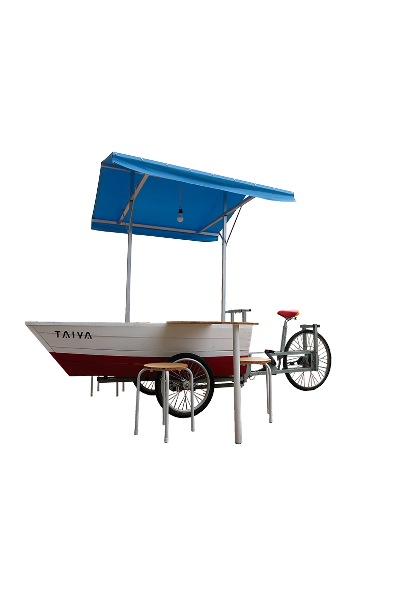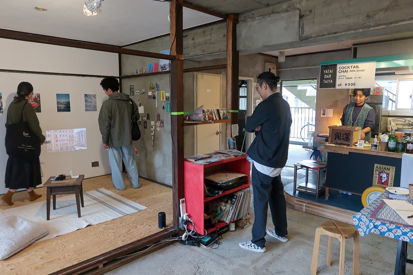 福岡市博多区美野島にあるTAIYA SPACEは、屋台建築家の下寺孝典さんが持つビルの一室。窓から陽の光が柔らかく差し込む部屋、白い壁にコンクリートの天井がのぞき、キッチンや板の間、生活感のあるここは展示、オフィス、アトリエ、カフェなどさまざまな用途の実験空間です。