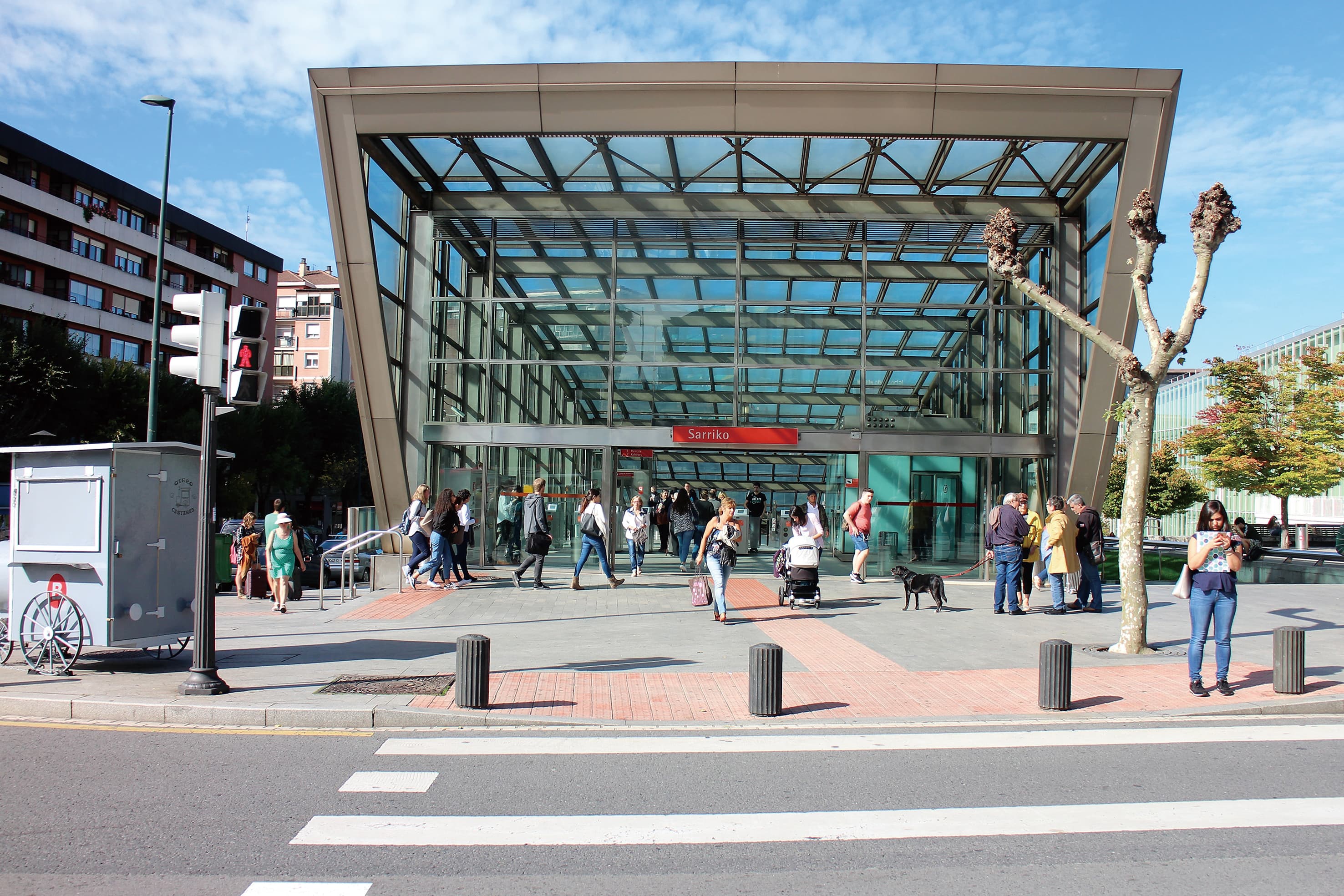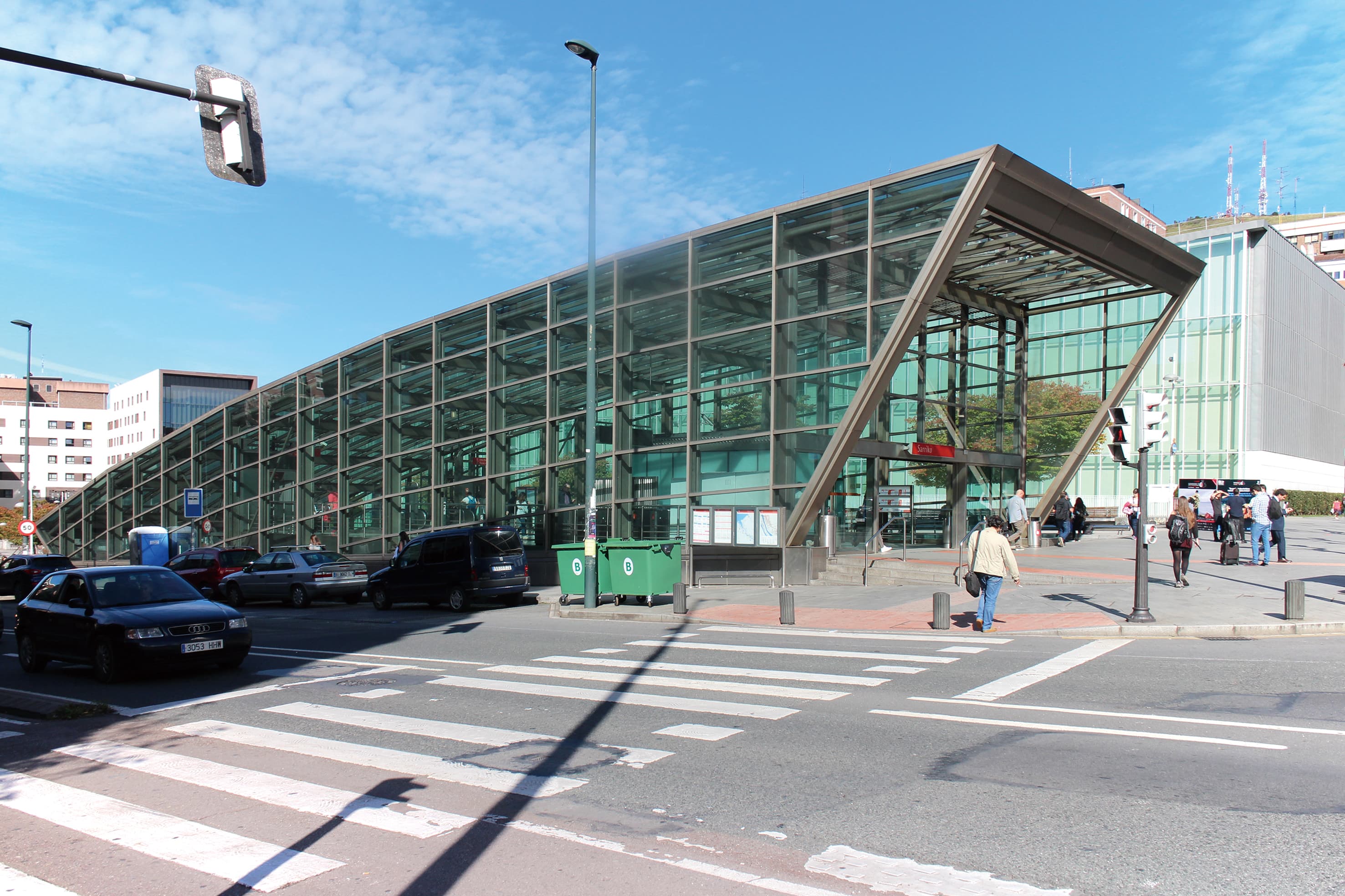 さて、このメトロは95年に開通しています。まずビルバオ市の中心街にあるモユアMoyua駅に行きますと、メトロの入り口がまるで戦闘機の風防のような総ガラス張りになっているのに目を惹かれます。駅内部に降りると、全体に空間がゆったりと広く作られていることを感じます。そして明るくモダンなデザイン性を感じます。