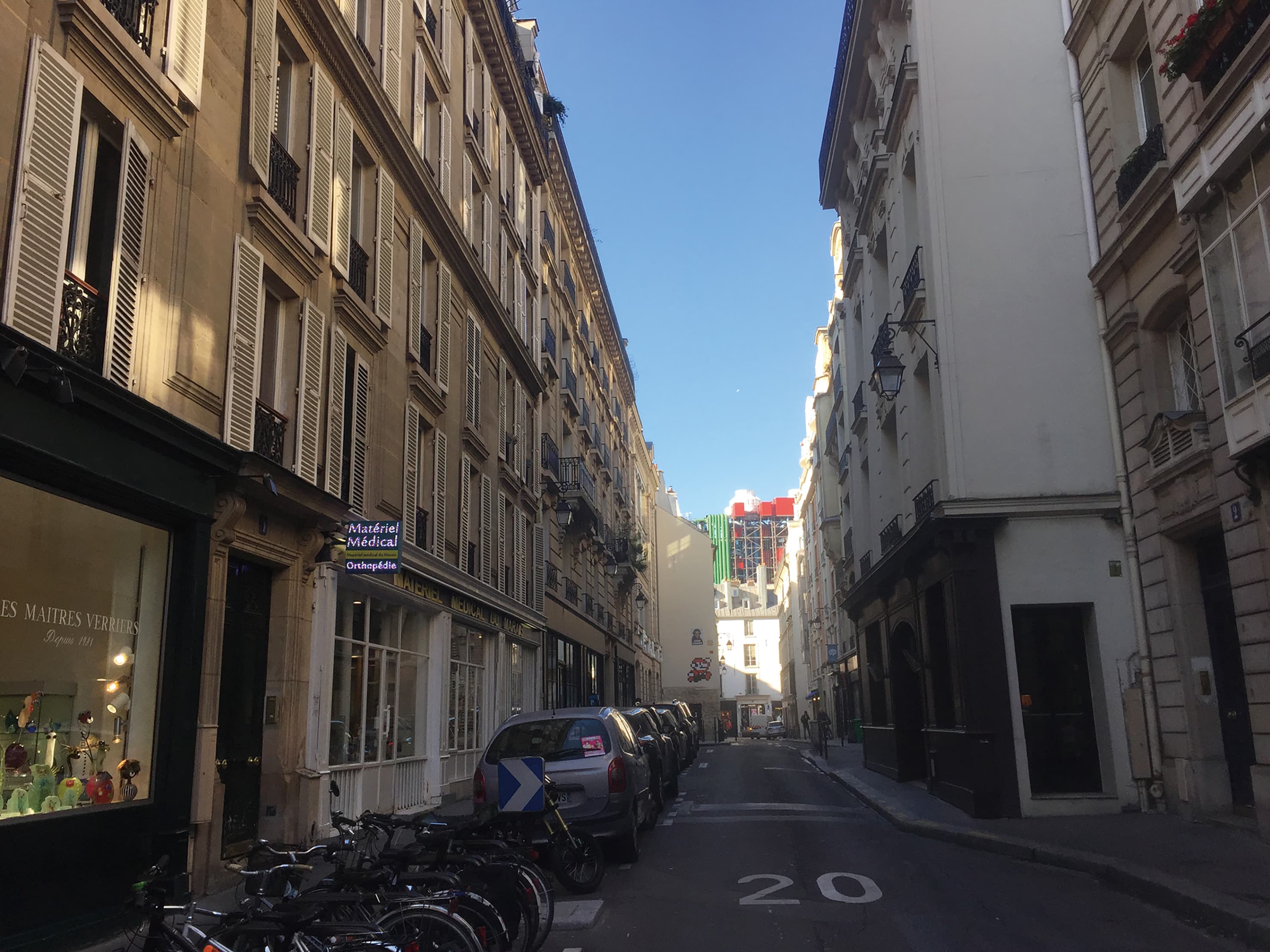 この施設があるのは、パリ4区のマレ地区と呼ばれる場所です。比較的古い建物が多く、中には歴史的建造物に指定され博物館などに利用されている建物もあります。付近の道路は狭く入り組んでいるところが多く、大規模な再開発は難しいと見られている地区でもあります。建物があるプラートル通り(Rue Plâtre)も狭い通りで、一車線のみの一方通行となっています。