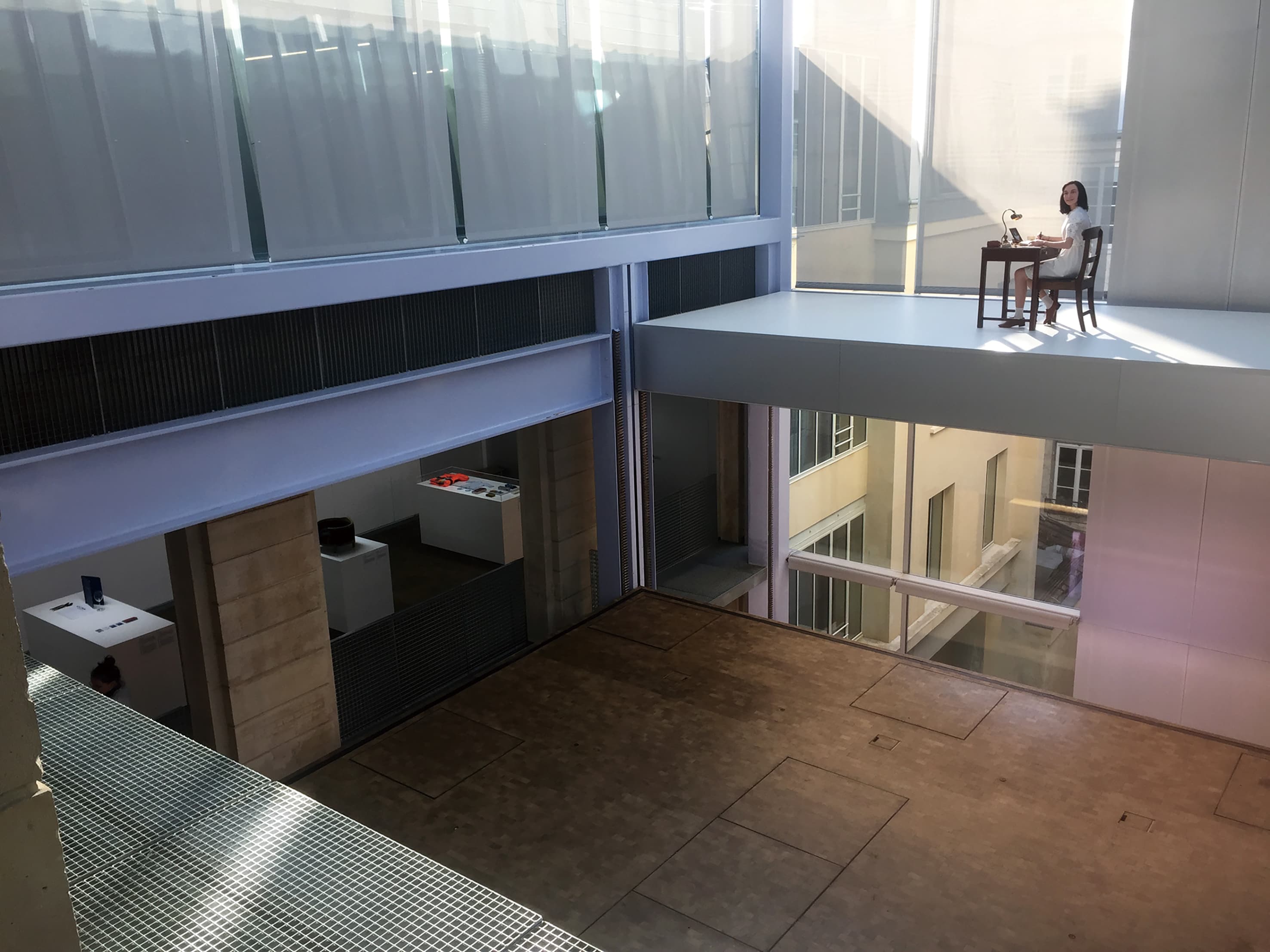 このような場所での再開発案件は、各種規制が厳しいこともあり、外観をあまり変えず内部のみを改造する手法がよく見られます。この建物は、内部全体が大きな吹き抜けになっていて、外観からは想像のつかない大空間を造り出していることに驚かされます。また内部は大きなガラス張りの展示スペースになっていて、もともと中庭だった部分を吹き抜けの空間として利用していることに気付きます。この部分には機械の力によって床ごと移動が可能な設備が付けられており、自在な展示空間が創出できるようにしてあります。この構造は入り口とは反対側の通路から見上げるとよくわかります。