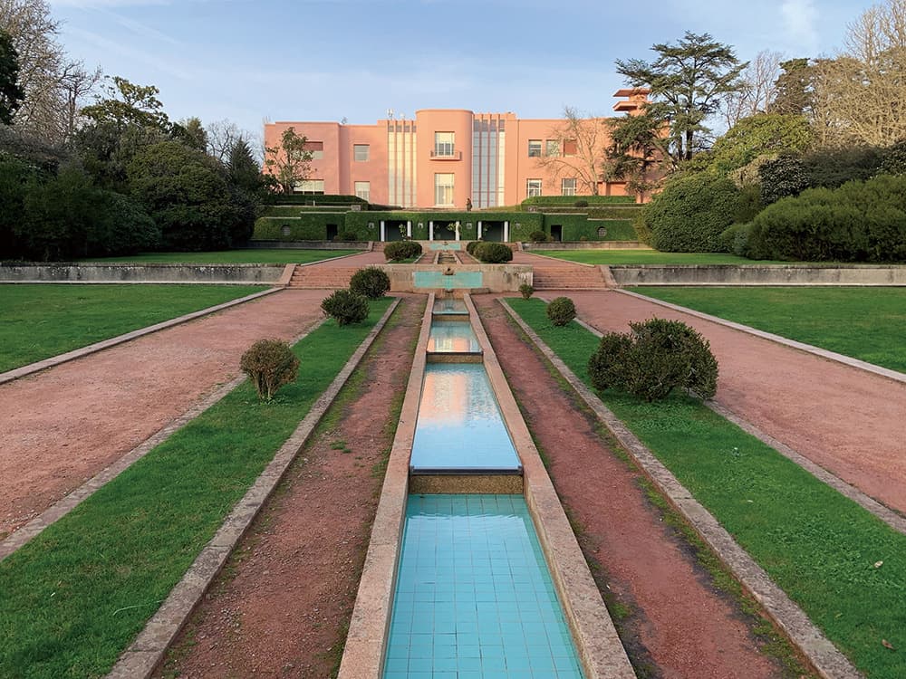 この公園にはもうひとつ特筆すべき建築があります。それは、カーサ・デ・セラルヴェスと呼ばれる、ホセ・マルケス・ダ・シルヴァ(José Marques da Silva)が1925年に設計したヴィラです。時代が少し古く、ポルトガルでは珍しいアール・デコ様式の建築として有名なようです。こぢんまりとしたシンメトリックな建物で、壁面のピンクの薔薇色が美しく感じられます。このピンク色の壁面は庭園の土の色と同色で建物と庭園の一体感が秀逸です。庭は幾何的なデザインの池や水路で構成されているフランス庭園様式になっています。庭園の周りには森林公園が広がっていて多くの人たちが散策を楽しんでいました。