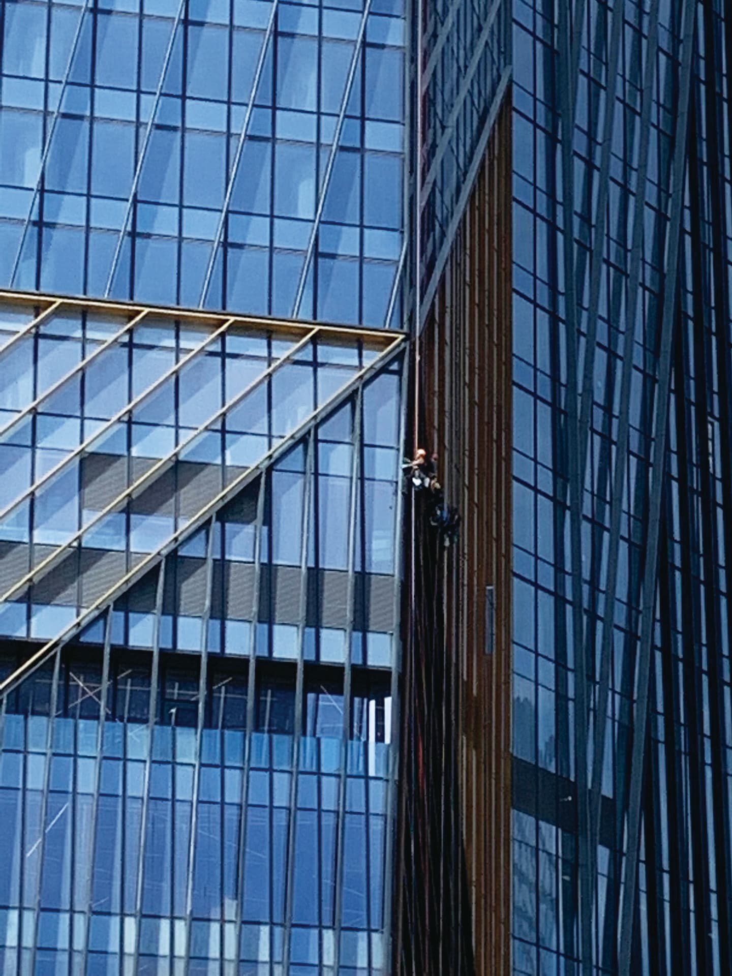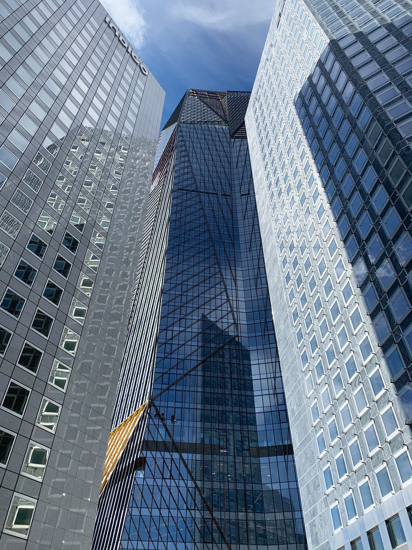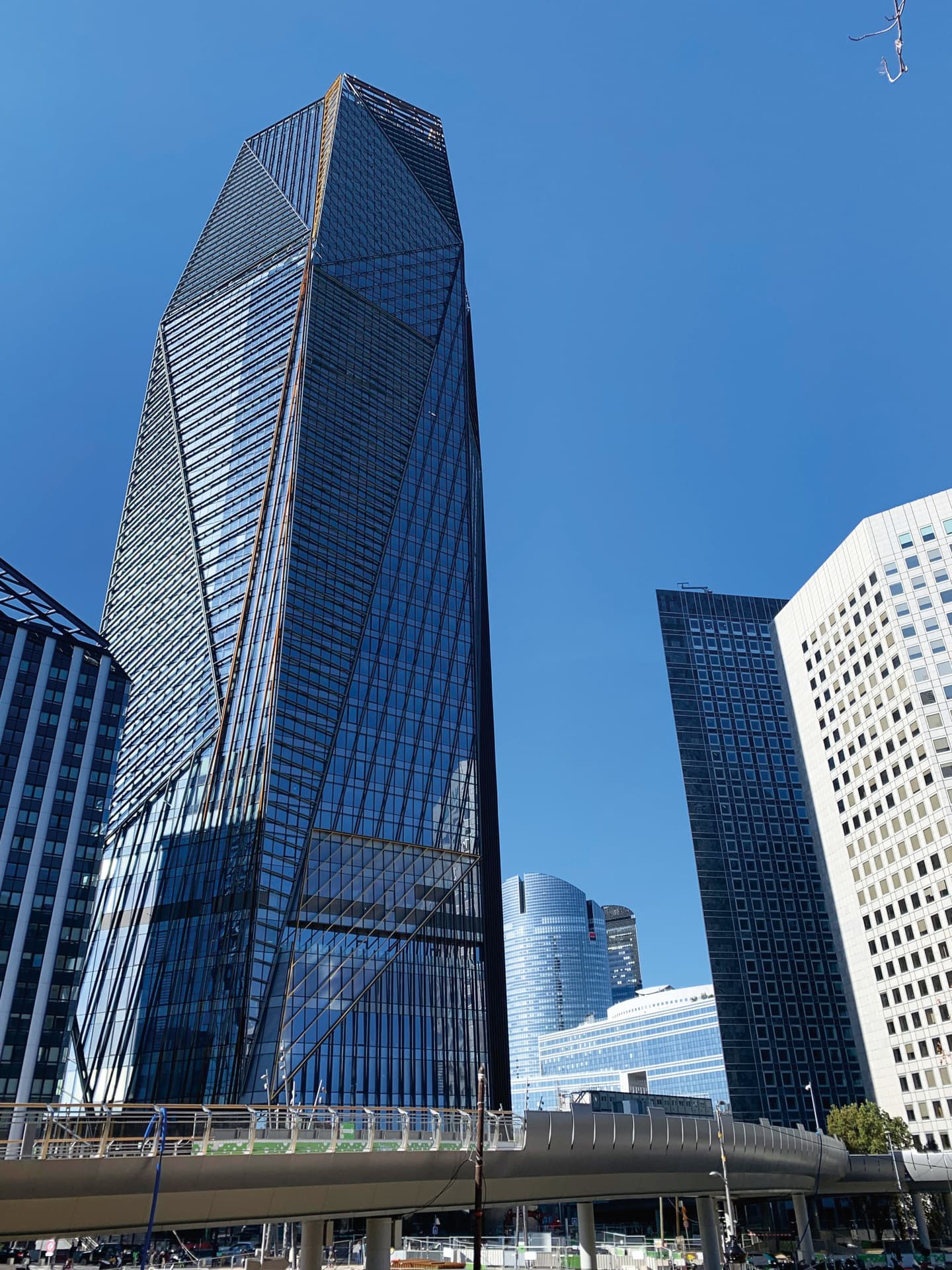 この建物は、ラ・デファンスの南西部分のピュトー(Puteaux)地区にあります。外面は、ほぼ全てがガラス張りになっているにもかかわらず、黒水晶の結晶を思わせる黒々とした印象を受けます。それは、外面全体が細い線状の鋼材で覆われており、それらが作る陰が影響しているようです。外壁の構成は三角形が複雑に組み合わされており、時にはそれらがオーバーハングしていて、見る者に非常に強いインパクトを与えます。