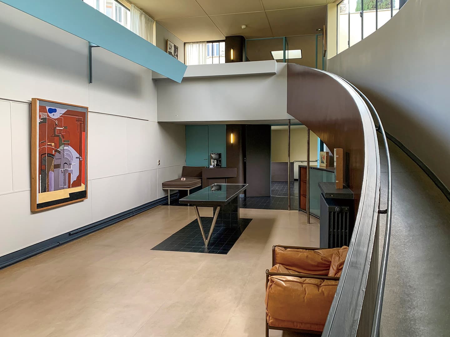 ギャラリーから図書室に上がる部分には階段ではなく、長いスロープが付けられています。これはル・コルビュジエが提唱した建築のプロムナードというコンセプトに基づいています。