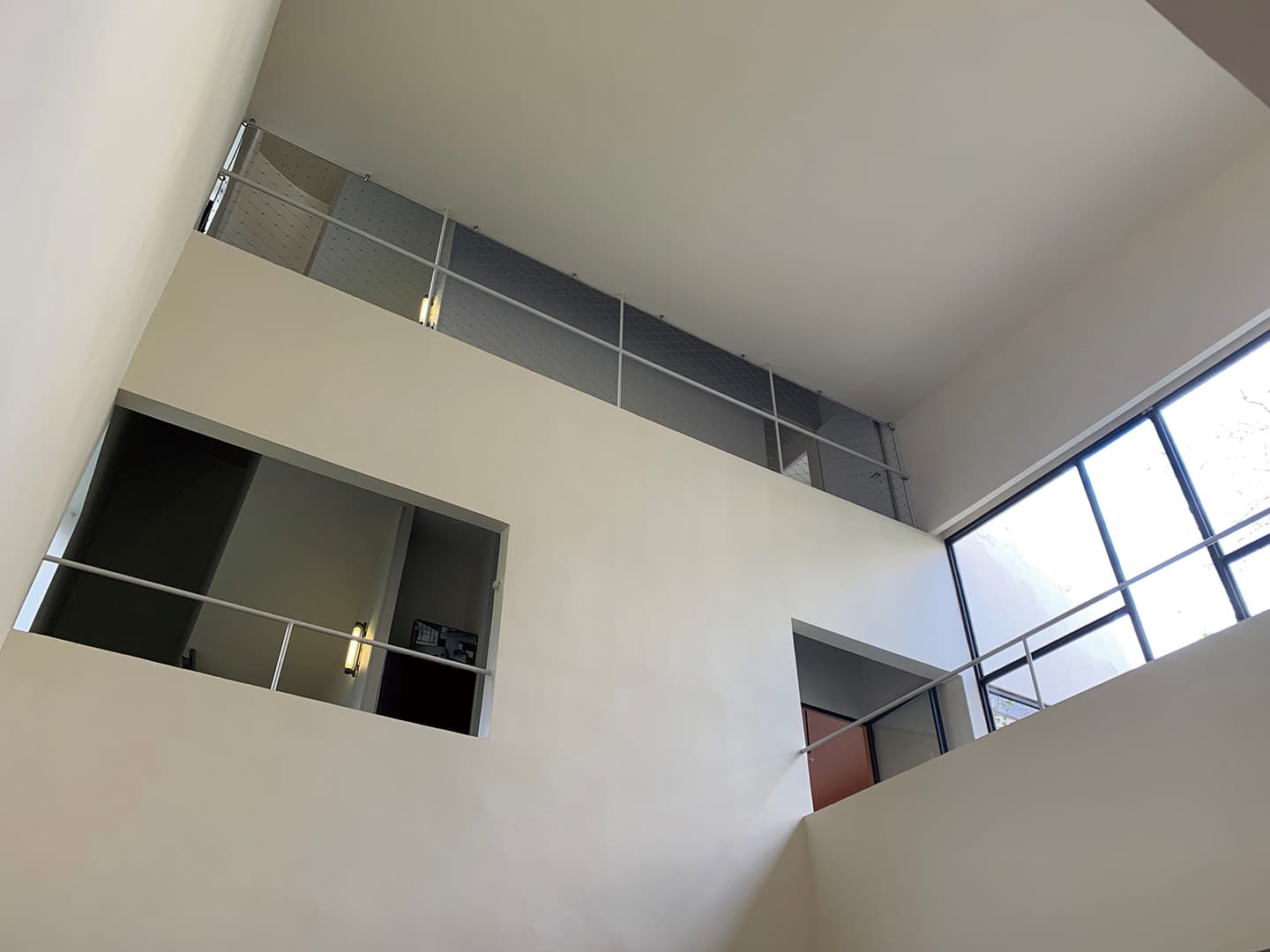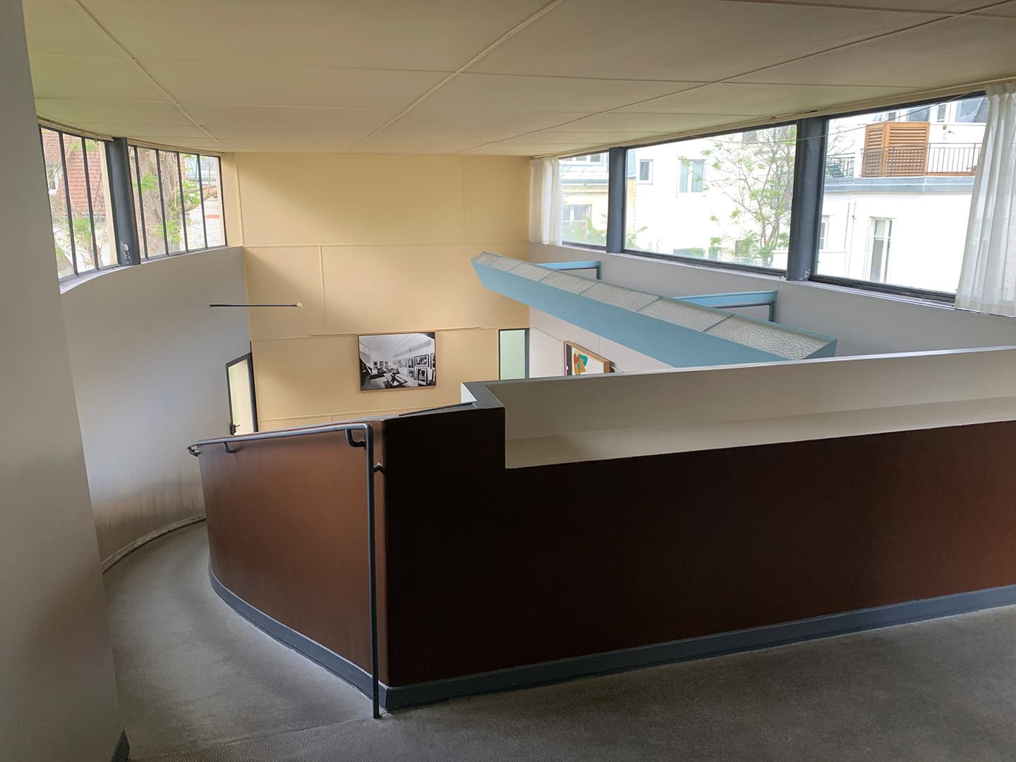 この5原則を確認しながらラ・ロッシュ邸を訪問してみると、まず入り口すぐの場所に「ピロティ」が見られ、1階部分全体が柱で持ち上げられた空間となっています。地面には植物が植えられ小さな庭園となっています。玄関ホールは3階分の高さの吹き抜けで、高い位置にある「水平連続窓」から外光が取り入れられています。ホールからはギャラリーに通じる階段と、プライベート部分に通じる階段が別々に付けられています。ギャラリーは「水平連続窓」で採光され、「自由な平面」が可能にする自由な空間が広がっています。