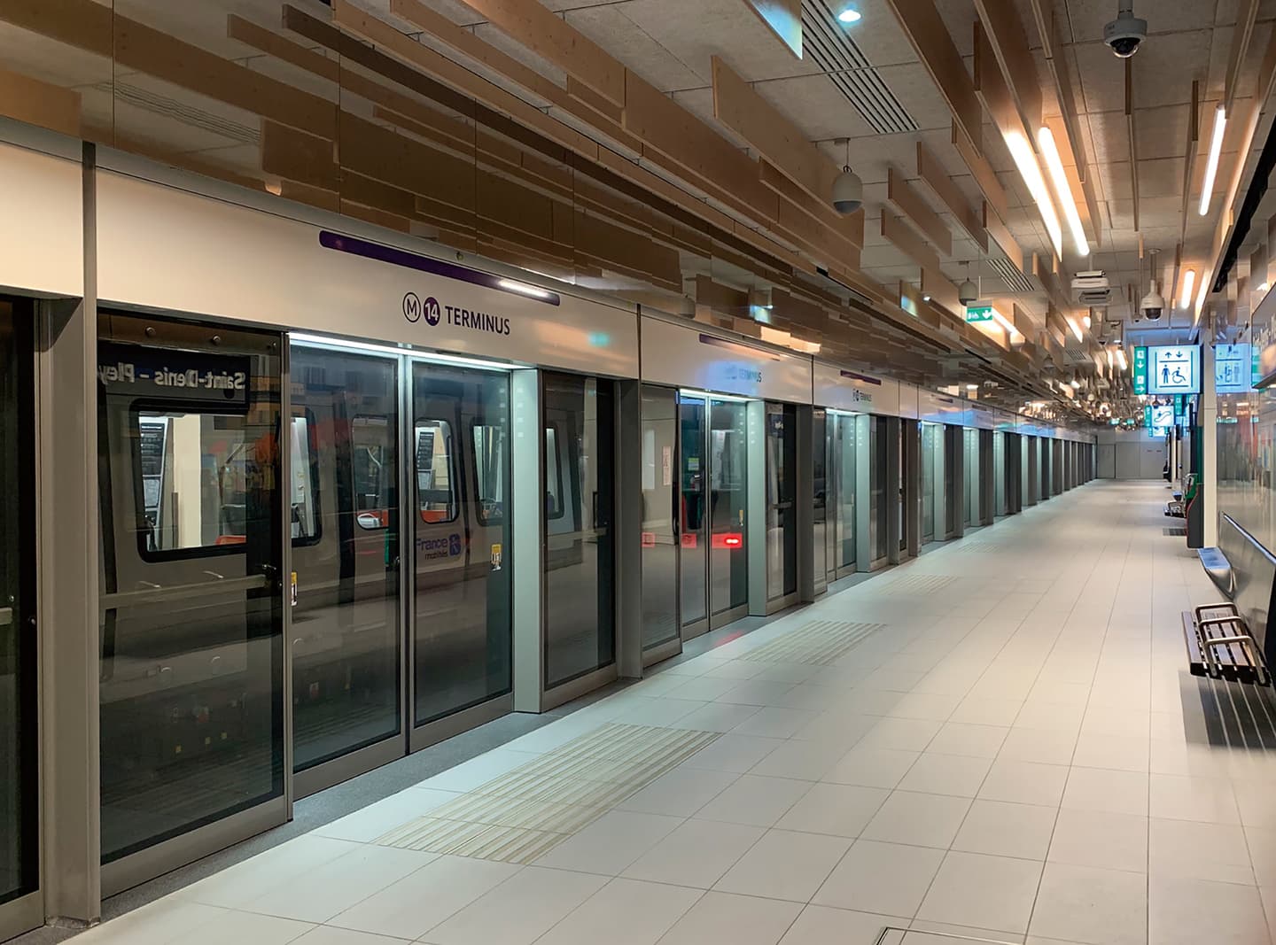 実は、現状は14番線だけが運用されていますが、今後2年間に、15、16、17番線が開通する予定です。これらの路線は、「大パリ構想」に基づく、パリ周辺部の鉄道網の充実計画に沿ったもので、サン・ドニ・プレイエル駅は、これらの路線の全てをまとめるハブの役割を果たす中核駅となることが計画されています。今後多くの乗降客が使用することが見通された計画になっています。