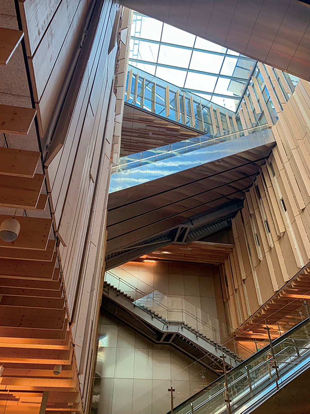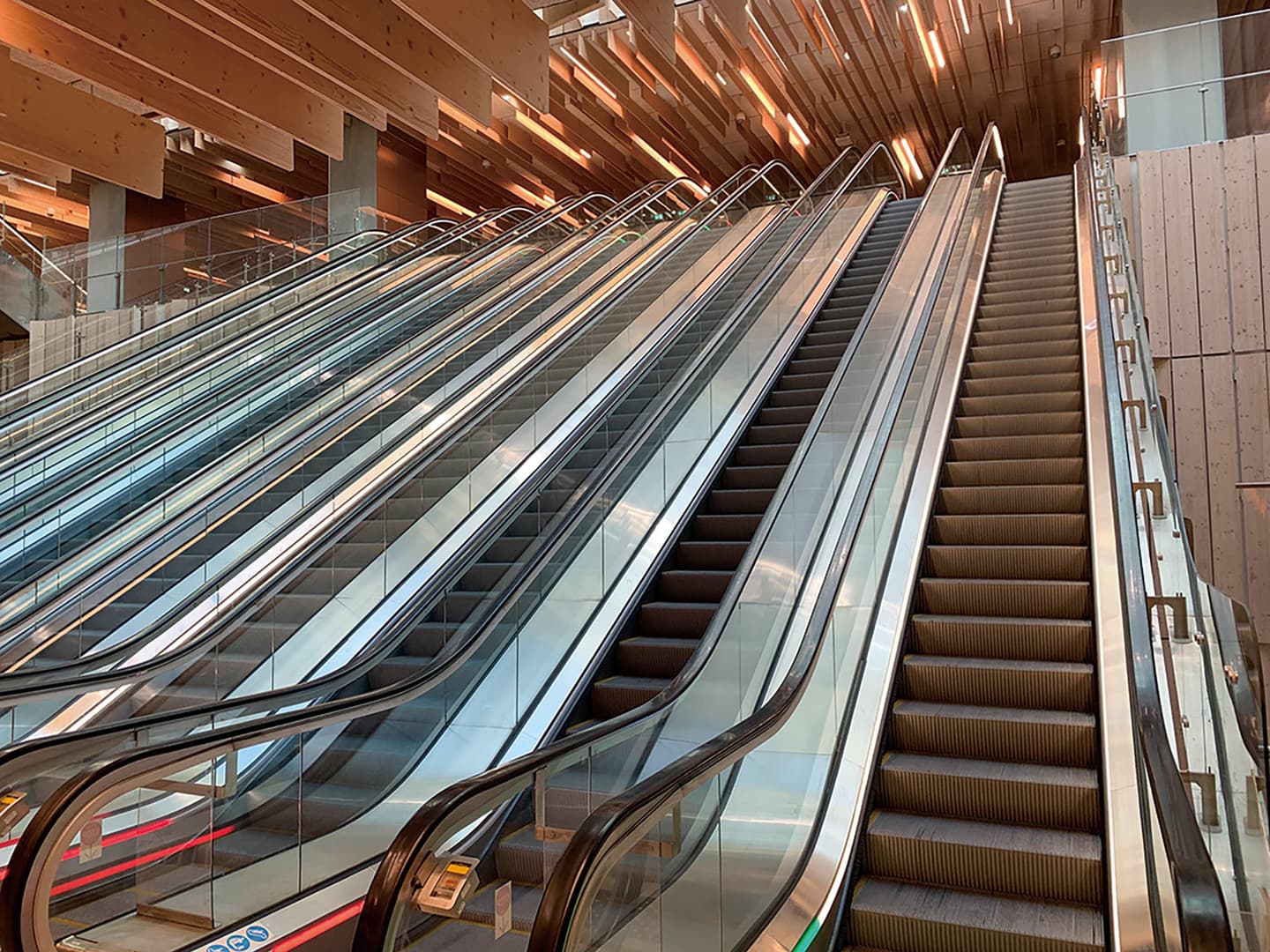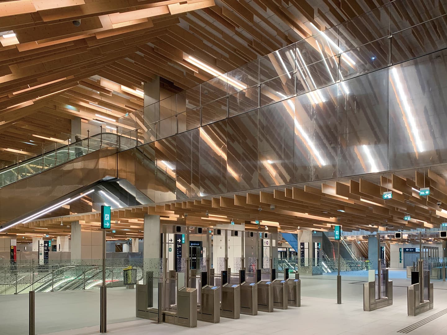 この駅には、隈研吾氏の建築の特徴が随所に見られます。最も目に付くのは、建築の随所に張り巡らされた木材の装飾です。また自然光を重視して、地下にまで光が届く吹き抜けを中央部に設けています。
