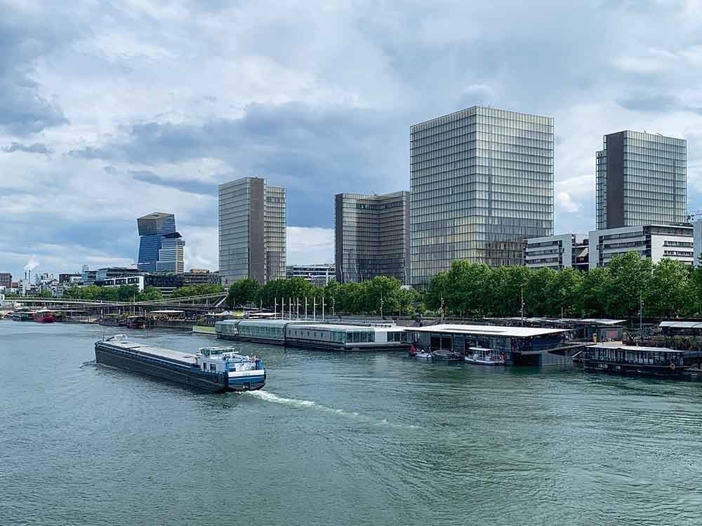 一方、ミッテラン図書館の建物は、フランスの建築家ドミニク・ペローの設計によるもので、広大な長方形の敷地の四隅に、すっきりとした直線を描く、本を開いた形のガラス張りの高層ビル(高さ100メートル)が並んでいます。そのシンプルな形態と機能性は、建築におけるミニマリズムの現れと言われています。建物の間の敷地は広大なエスプラナードになっていて、自由に往来でき、パリの都市機能に完全に溶け込んでいます。対岸のべルシー地区とは、歩行者専用の橋が懸かっていて、快適な散策路が続いています。