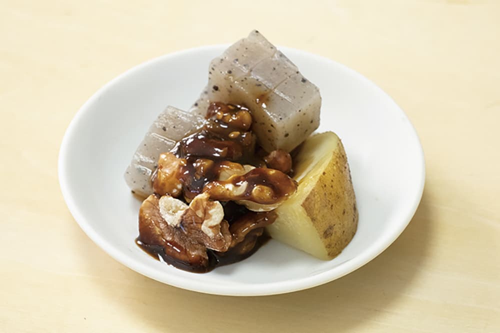 一口大に切って茹でたこんにゃくとジャガイモに、クルミ味噌を絡めるだけ!