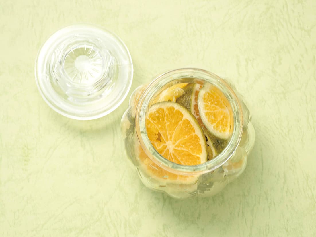 ① 青みかんを洗い、しっかり水分を拭き取って薄くスライスする。