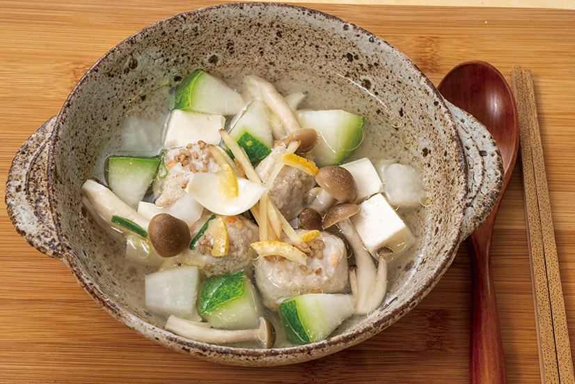 ② ①の灰汁を取った後に冬瓜と大根を入れ、具材が透明になるまで煮る。