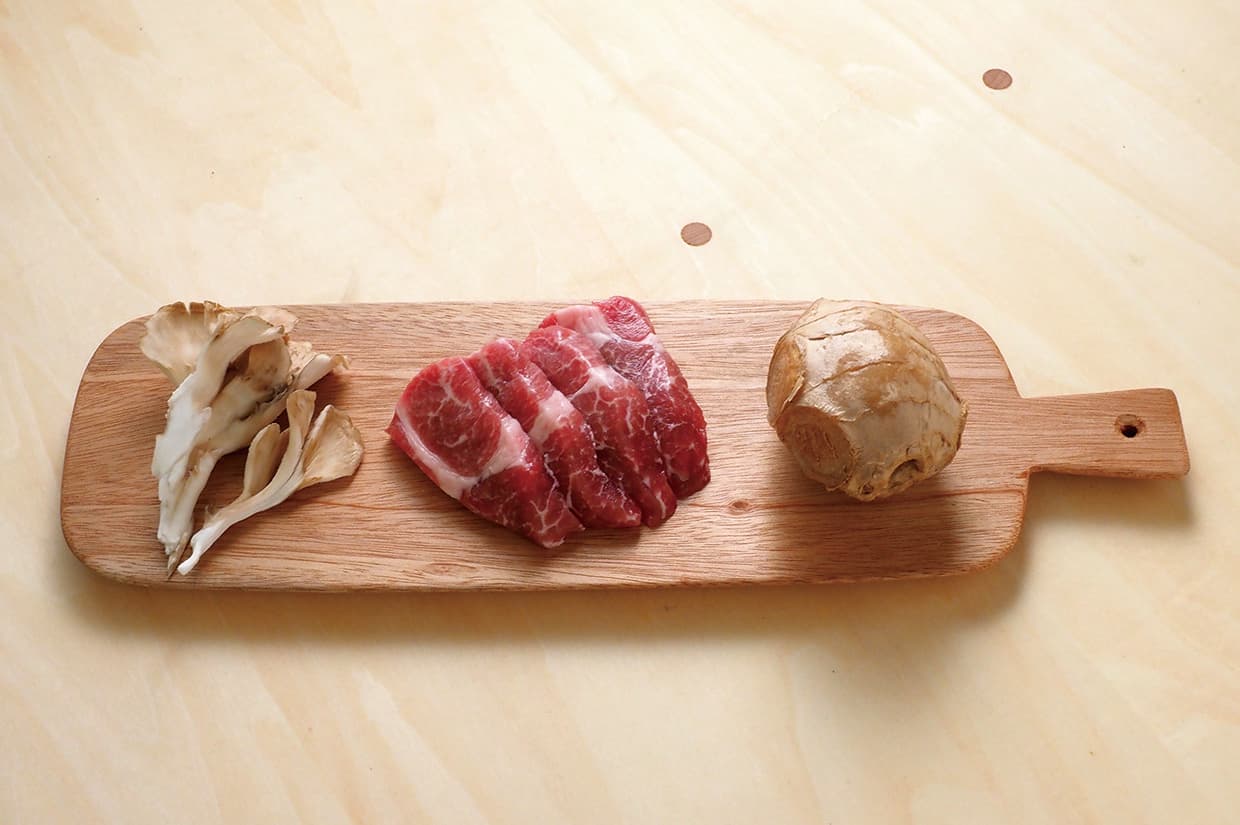 豚肉(左右にあるのは、豚肉と相性の良い食材:キノコ類と生姜)