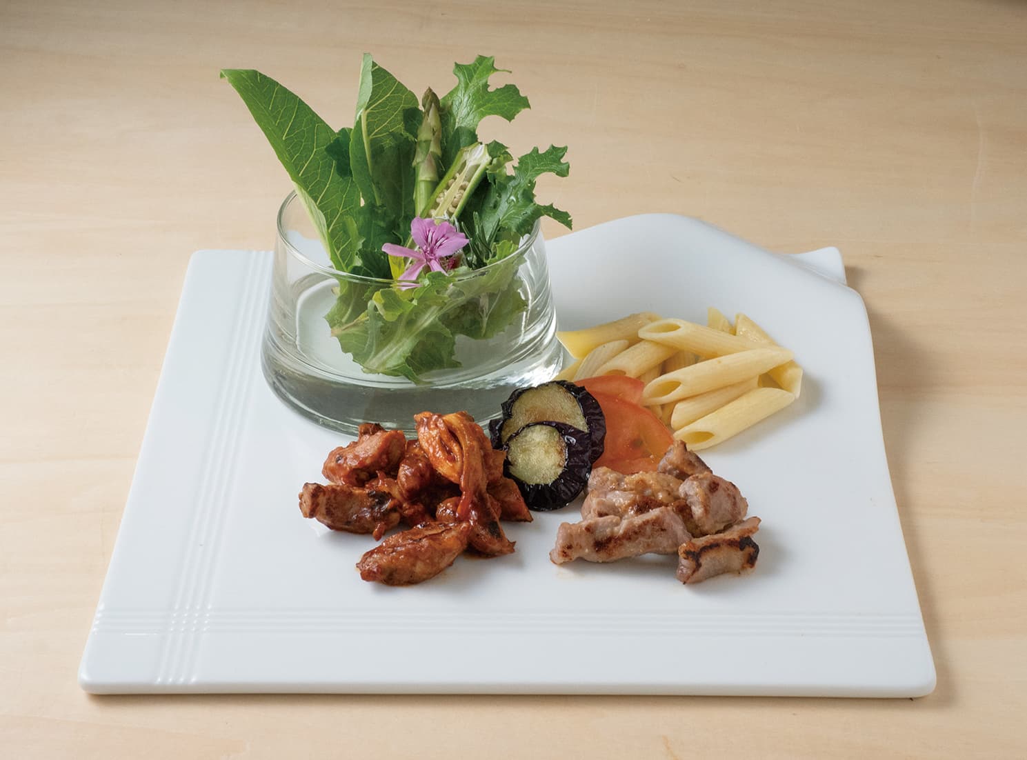 ② フライパン(弱火)で、①を火が通るまで炒める。添え物には、ソテーした夏野菜や山椒・山椒の実などがお勧めです。