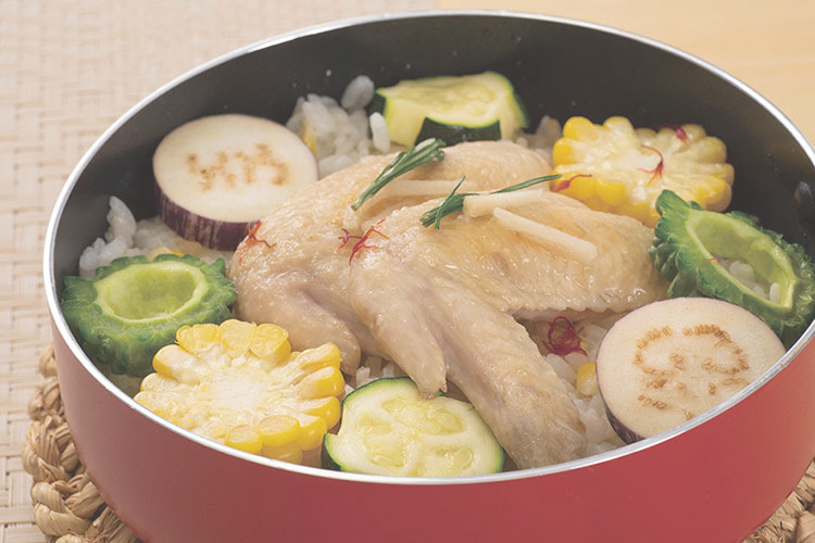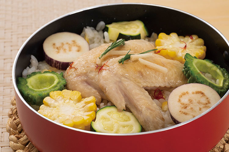 ① フライパンに基本のスープとお米を入れ、その上に手羽先とトウモロコシを入れて蓋をし、弱火でお米を炊く(20~25分)