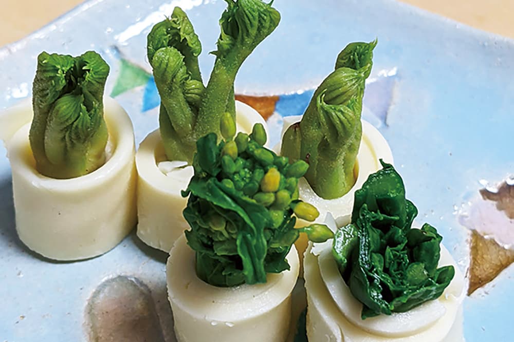 湯がいてあく抜きした山菜(菜の花・タラの芽)をスライスチーズで巻き出来上がり。